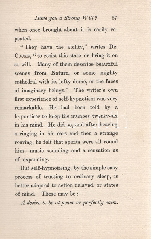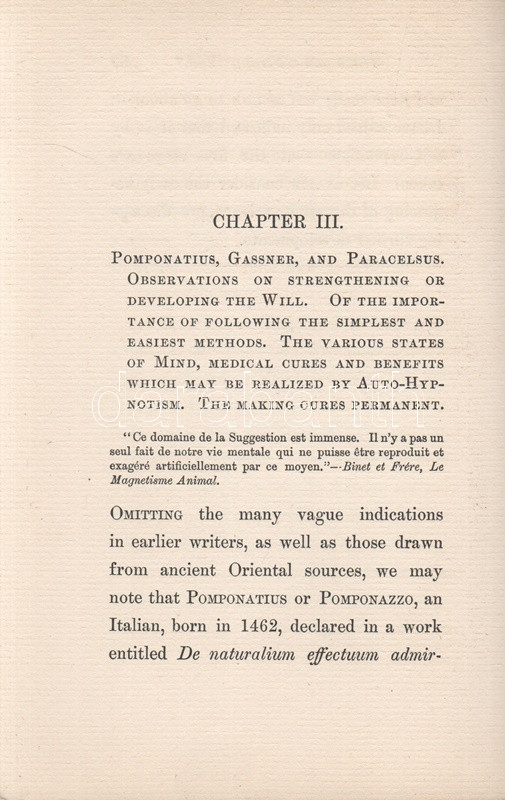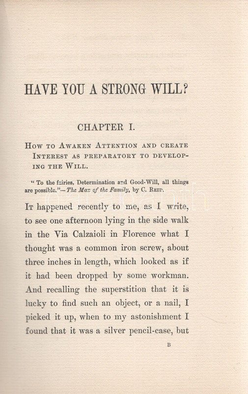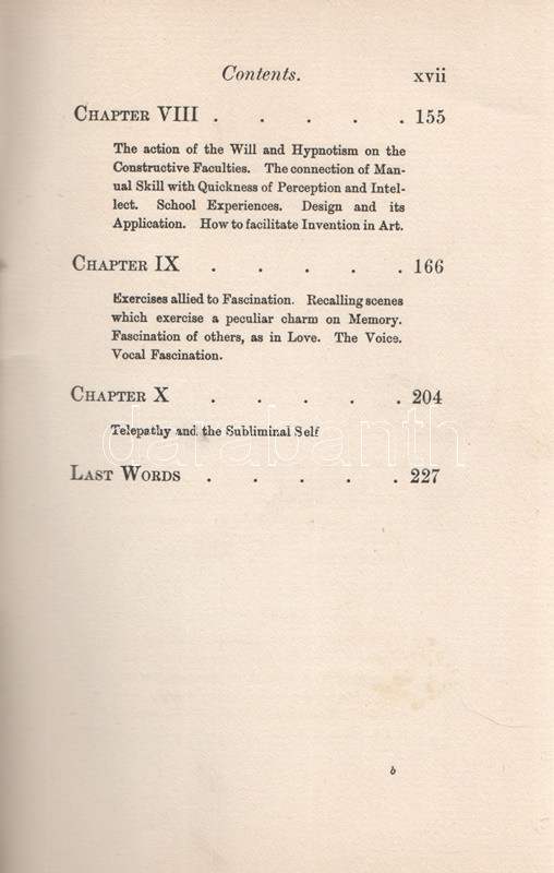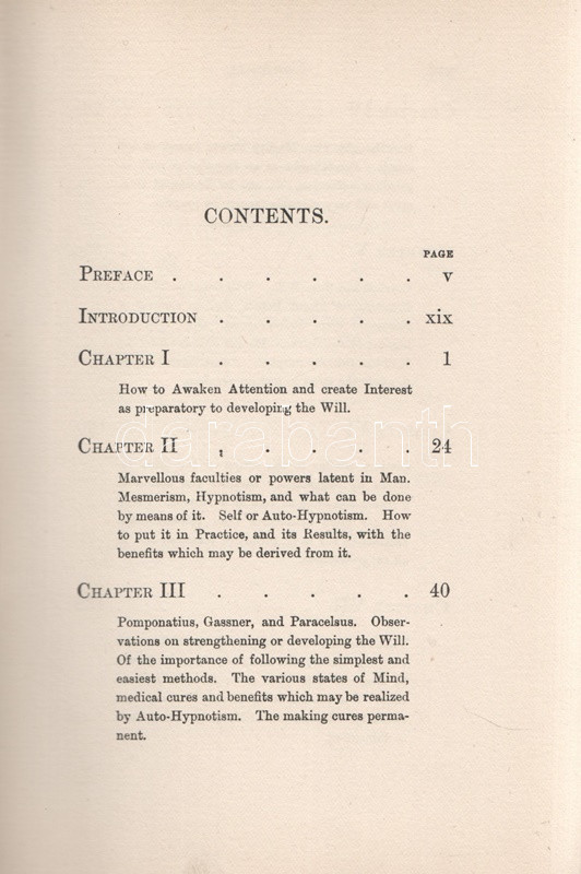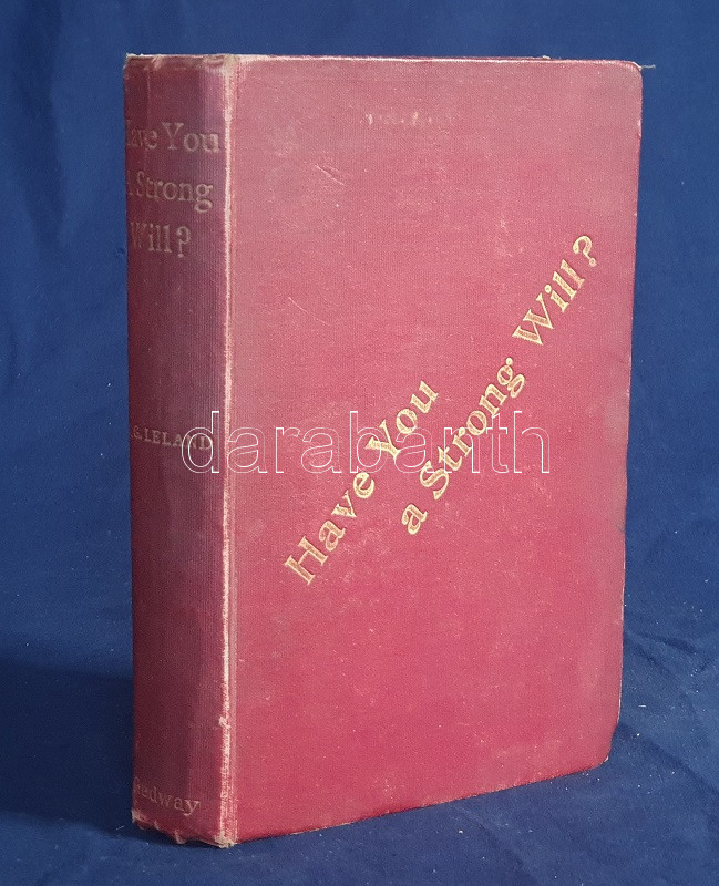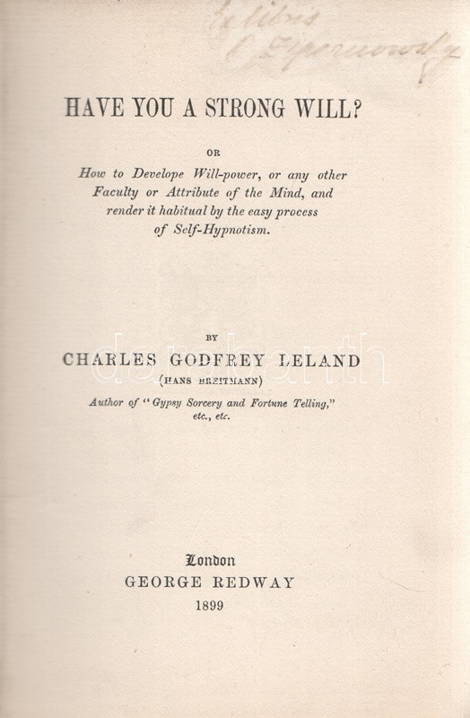Leland, Charles Godfrey (Breitmann, Hans): Have You A Strong Will? Or How to Develop Will-power, or any other Faculty or Attribute of the Mind, and Render it Habitual by the Easy Process os Self-Hypnotism. London, 1899. George Redway (Barnicott and Pearce Printers). XXXII + 235 + [5] p. Első kiadás. Charles Godfrey Leland (1824-1903) amerikai újságíró, kalandor, néprajzkutató, az újkori boszorkánykutatás úttörője. Élete végén írt olvasmányos kötete az emberben szunnyadó ezoterikus képességek témáját: a hipnózis, a szuggesztió, az ön-szuggesztió kérdéseit járja körül, némi kitekintéssel a paratudományok tudománytörténetére, Gassner és Paracelsus munkásságára. A címoldalon elhalványult, régi tulajdonosi bejegyzés, néhány oldalon aláhúzások. Poss.: Ex libris A. Zipernowszky. Aranyozott, enyhén kopott kiadói egészvászon kötésben. Jó példány.
