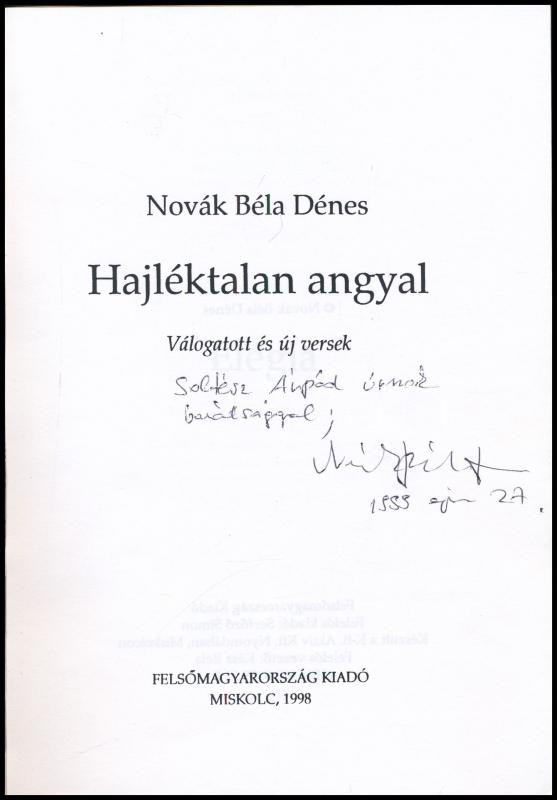 Novák Béla Dénes: Hajléktalan angyal. A szerző (?-2020) által DEDIKÁLT... https://www.darabanth.com/hu/471-Gyorsarveres/471.0/Konyvek/Konyvek-Egyeb-ritkasagok~1000037/Novak-Bela-Denes-Hajlektalan-angyal-A-szerzo-2020-altal-DEDIKALT-Miskolc-1998-Felso~II2905078