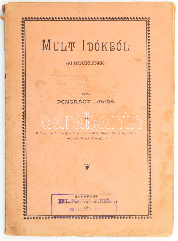 Pongrácz Lajos: Mult időkből. (Elbeszélések.) Bp., 1897, Központi Könyvnyomda-Vállalat, 4+89+2 p. Kiadói papírkötés, sérült gerinccel és kötéssel, foltos borítóval.