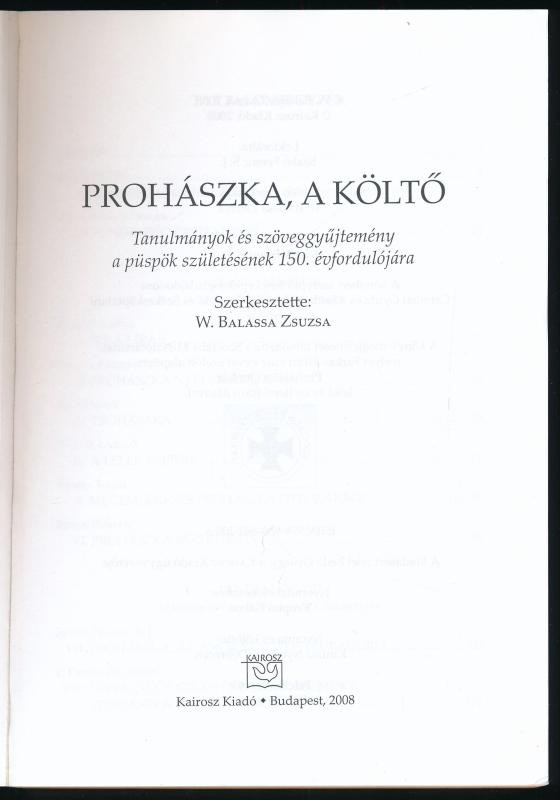 Prohászka, a költő. Tanulmányok és szöveggyűjtemény a püspök születésének 150. évfordulójára. Szerk.: W. Balassa Zsuzsa. Bp., 2008, Kairosz. Kiadói papírkötés.