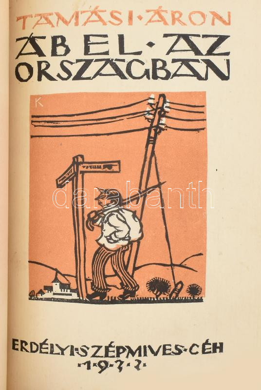 Tamási Áron: Ábel trilógia. [Egy kötetbe kötve.] Ábel a rengetegben. Gróf Bánffy Miklós illusztrációival. Kolozsvár, 1932, Erdélyi Szépmíves Céh, ("Minerva"-ny.), 192+2 p. Első kiadás. Az eredeti illusztrált elülső borítót bekötötték. A borító linómetszete Kós Károly munkája. Számozatlan példány.; Ábel az országban.Gróf Bánffy Miklós illusztrációival. Kolozsvár, 1933, Erdélyi Szépmíves Céh, ("Minerva"-ny.), 211+5 p. Első kiadás. Az eredeti illusztrált elülső borítót bekötötték. A borító linómetszete Kós Károly munkája. Számozatlan példány.; Ábel Amerikában.Gróf Bánffy Miklós illusztrációival. Kolozsvár, 1934, Erdélyi Szépmíves Céh, ("Minerva"-ny.), 248+2 p. Első kiadás. Az eredeti illusztrált elülső borítót bekötötték. A borító linómetszete Kós Károly munkája. Számozatlan példány.; Könyvkötői átkötött aranyozott, álbordás gerincű félbőr-kötés, az első kötet papírborítója foltos, jó állapotban.