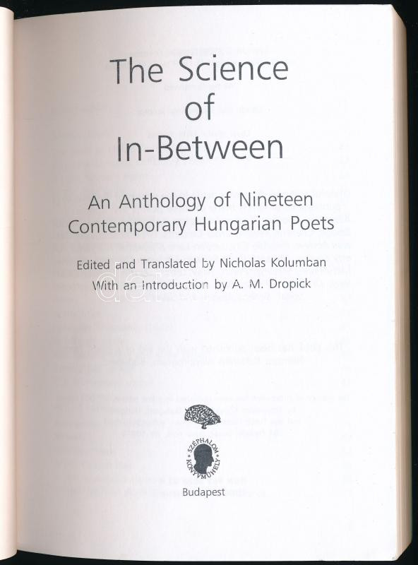 The Science of In-Between. An Anthology of Nineteen Contemporary Hungarian Poets. Edited and Translated by Nicholas Kolumban. With an Introduction by A. M. Dropick. Bp., 1999, Széphalom Könyvműhely. Angol nyelven, többek közt Csoóri Sándor, Faludy György, Farkas Árpád verseinek fordításaival. Kiadói papírkötés.