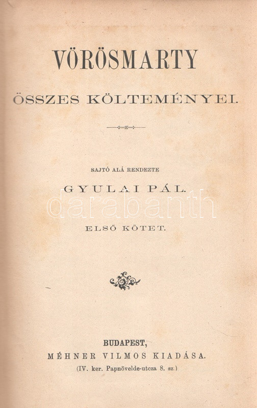 Vörösmarty (Mihály): Vörösmarty összes költeményei I-II. Sajtó alá rendezte Gyulai Pál. (Népszerű kiadás.) [Teljes mű két kötetben.] Budapest, [1895]. Méhner Vilmos kiadása (Nagy Sándor könyvnyomdája). 1 t. (hártyapapírral védett címkép) + 734 p.; 751 + [1] p. Vörösmarty Mihály munkáit az 1860-as években Ráth Mór, az 1880-as években Méhner Vilmos adta ki. A Méhner Vilmos-féle vállalat a nyolckötetes életműkiadás mellett megjelentette Vörösmarty életművének kétkötetes, népszerű kiadását is, mely célkitűzésének megfelelően nélkülözi az életrajzot, a költő prózáját és publicisztikáját, ám a legszorosabb értelemben vett Vörösmarty-korpuszt - azaz líráját, elbeszélő költészetét, drámaírói munkásságát és drámafordításait - hiánytalanul közli. Egységes, aranyozott, festett kiadói egészvászon kötésben, márványmintás festésű lapszélekkel. Jó példány.