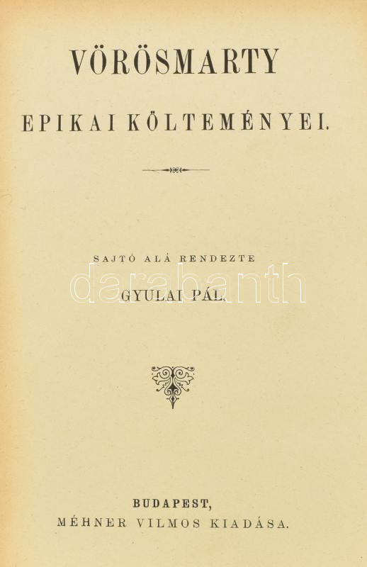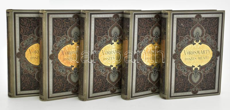 Vörösmarty összes költeményei I-II, IV-VI. köt. Sajtó alá rendezte: Gyulai Pál. I. köt.: Lyrai költemények.; II. köt.: Epikai költemények.; IV-V. köt.: Drámai költemények. II-III. kötet.; VI. köt.: Vegyes maradványok. Bp.,én,Méhner Vilmos. Az I. kötetben Vörösmarty arcképével. Kiadói aranyozott, festett egészvászon-kötések, kissé kopott, kissé foltos borítókkal, az I. kötetben az címkép, a címlap és további 1 lap kijár, a VI. kötetben az elülső előzéklap szakadt.