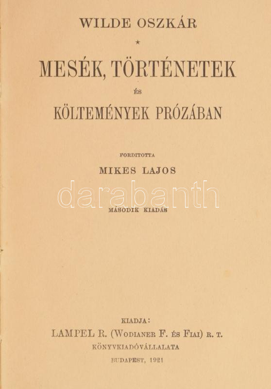 Wilde Oszkár: Mesék, történetek és költemények prózában. Fordította: M... https://www.darabanth.com/hu/471-Gyorsarveres/471.0/Konyvek/Konyvek-Egyeb-ritkasagok~1000037/Wilde-Oszkar-Mesek-tortenetek-es-koltemenyek-prozaban-Forditotta-Mikes-Lajos-Wilde-Os~II3193433