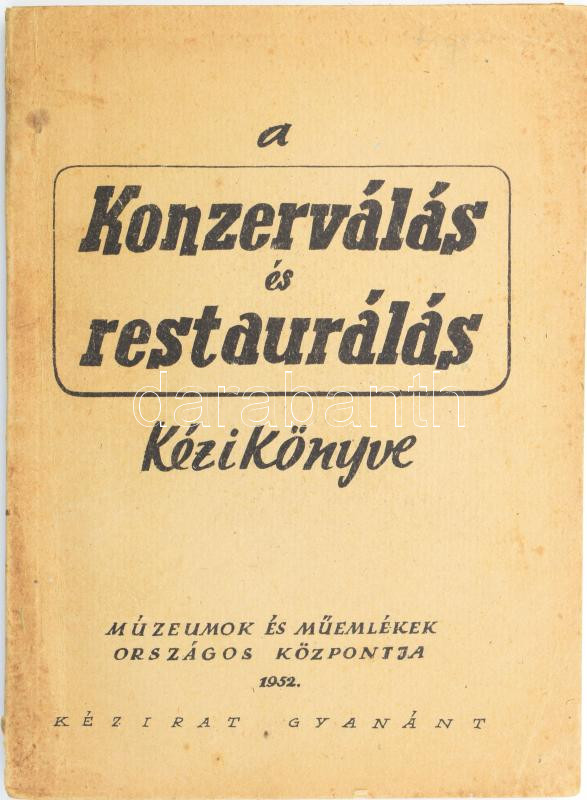 A konzerválás és restaurálás kézikönyve. Kézirat gyanánt. Szerk.: Lakos Lajos. Bp., 1952., Múzeumok és Műemlékek Országos Központja, 8+88 p. Kiadói papírkötés, foltos borítóval.