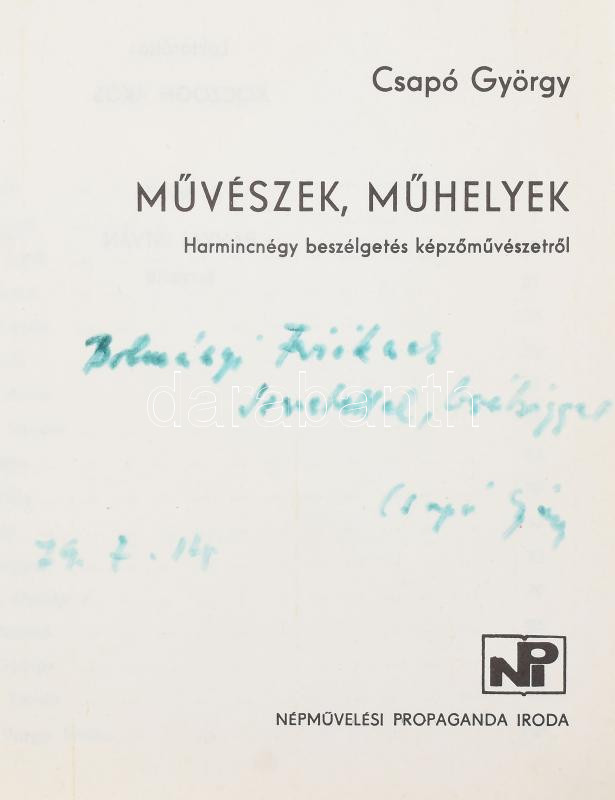 Csapó György: Művészek, műhelyek. A szerző, Csapó György (1920-1989) író, újságíró által Bolmányi Ferenc (1904-1990) festőművésznek DEDIKÁLT példány! Harmincnégy beszélgetés képzőművészetről. Anna Margit, Barcsay Jenő, Bálint Endre, Bencze László, Berki Viola, Bernáth Aurél, Bortnyik Sándor, Csáji Attila, Czóbel Béla, Deim Pál, Frank Frigyes, Z. Gács György, Gross Arnold, Hegyi György, Hencze Tamás, Ilosvai Varga István, Kassa János, Klimó Károly, Kmetty János, Kokas Ignác, Kurucz D. István, Martyn Ferenc, Miháltz Pál, Pásztor Gábor, Ruzicskay György, Schönberger Armand, Somos Miklós, Swierzkiewicz Róbert, Szabó Vladimir, Szántó Piroska, Szemethy Imre, Tóth Menyhért, Udvardi Erzsébet, Vaszkó Erzsébet. [Bp., 1979], Népművelési Propaganda Iroda. Kiadói papírkötés, kijáró címlappal.