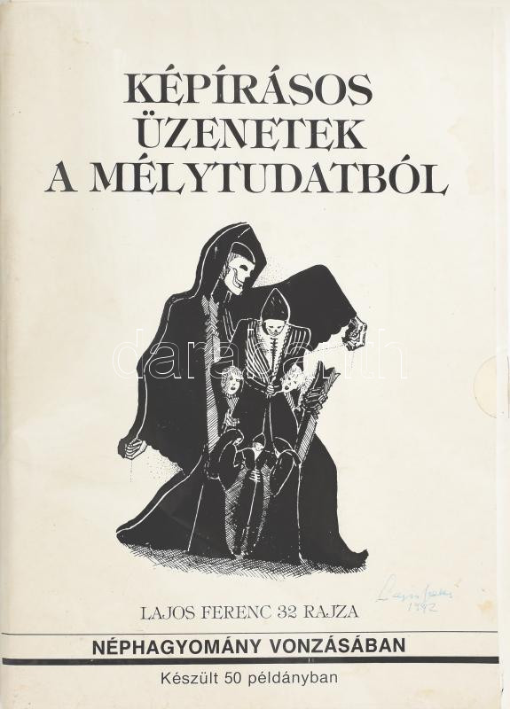 Leírás: Lajos Ferenc Képírásos üzenetek a mélytudatból Bp., 1992. 32 T Készült 50 példányban. Aláírt mappában 20x30 cm
