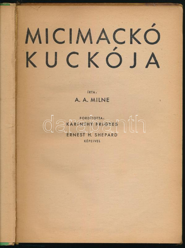 Milne, A[lan] A[lexander]: Micimackó kuckója. Ford.: Karinthy Frigyes.... https://www.darabanth.com/hu/471-Gyorsarveres/471.0/Konyvek/Konyvek-Mesekonyvek-ifjusagi-irodalom~1000035/Milne-Alan-Alexander-Micimacko-kuckoja-Ford-Karinthy-Frigyes-Ernest-H-Shepard-kepeivel~II3155764