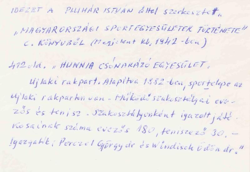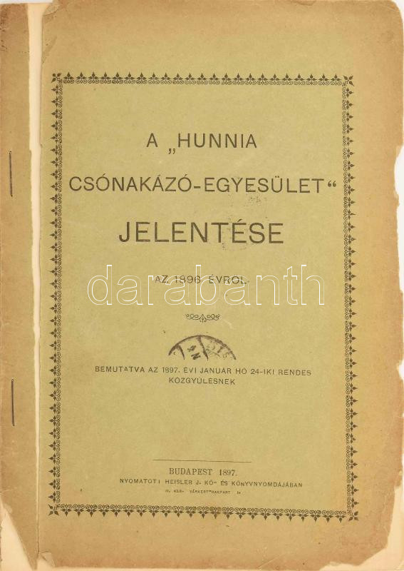 A ,,Hunnia Csónakázó-Egyesület" jelentése az 1896. évről. (Bemutatva az 1897. évi január hó 24-iki rendes közgyűlésnek). Bp., 1897, Heisler J. kő- és könyvnyomdája, 30+(2) p. Kiadói tűzött papírkötés, sérült borítóval, az elülső borító levált, a hátsó borítón postai bélyegzéssel. Az 1942-ben megjelent, Magyarországi sportegyesületek története c. könyv (szerk.: Pluhár István) a következőket írja az egyesületről (412. old.): ,,Hunnia Csónakázó Egyesület, Ujlaki rakpart. Alapítva 1882-ben, sport(t)elepe az újlaki rakparton van. Működő szakosztályai evezős és tenisz. Szakosztályonként igazolt játékosainak száma evezős 180, teniszező 30. -- Igazgatók: Perczel György dr. és Windisch Ödön dr." Ritka!