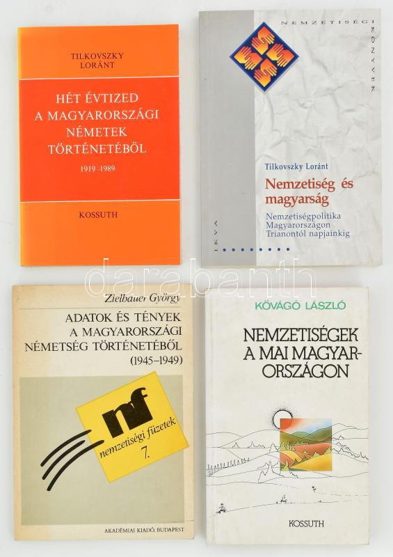 4 db nemzetiségi témájú könyv: Tilkovszky Loránt: Hét évtized a magyarországi németek történetéből 1919-1989.; Nemzetiség és magyarság. Nemzetiségpolitika Magyarországon Trianontól napjainkig.; Zielbauer György: Adatok és tények a magyarországi németség történetéből (1945-1949).; Kővágó László: Nemzetiségek a mai Magyarországon. Kiadói papírkötés, vegyes állapotban.