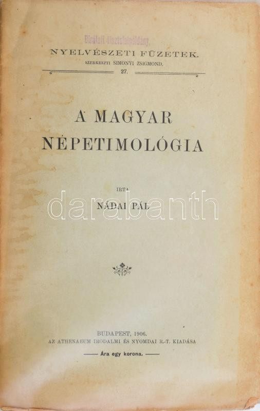 Nádai Pál: A magyar népetimológia. Nyelvészeti füzetek 27. Bp., 1906.,... https://www.darabanth.com/hu/471-Gyorsarveres/471.0/Konyvek/Konyvek-Tarsadalomtudomany~1000028/Nadai-Pal-A-magyar-nepetimologia-Nyelveszeti-fuzetek-27-Bp-1906-Athenaeum-38plus1-p-Kiad~II3186041