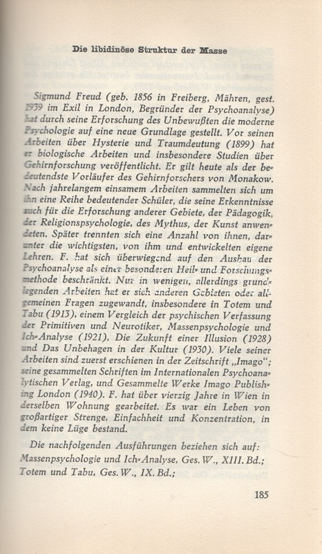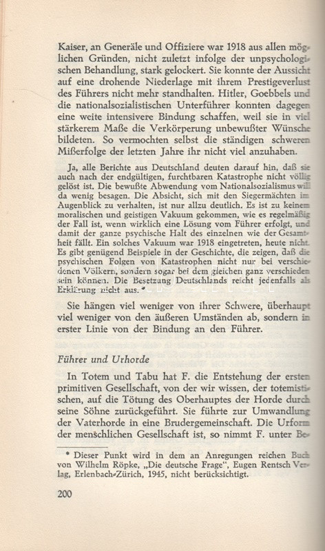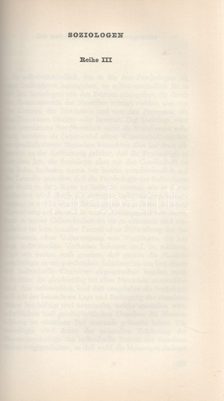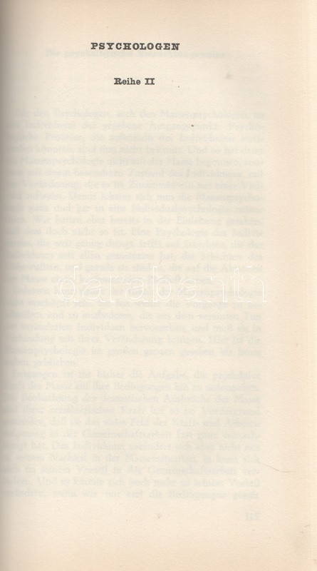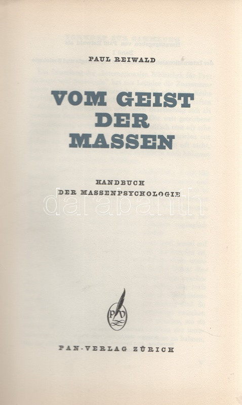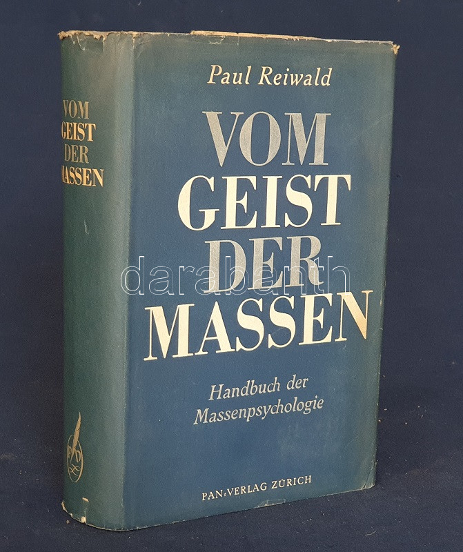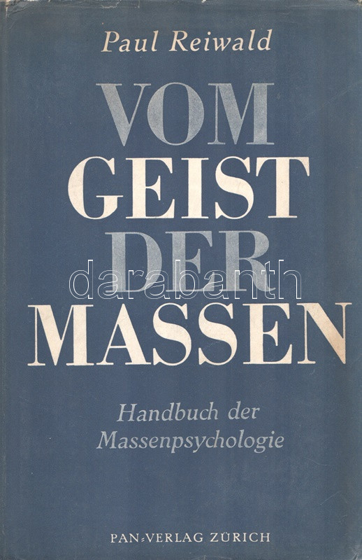 Reiwald, Paul: Vom Geist der Massen. Handbuch der Massenpsychologie. Zürich, (1946). Pan-Verlag (ABC Druckerei & Verlags). XV + [1] + 631 + [1] p. Paul Reiwald (1895-1951) német jogász és kriminológus, a pszichoanalitikai kriminológia irányzatának képviselője. A szociáldemokrata ihletettségű elméletíró 1933 után Svácban dolgozott. Tömeglélektani kézikönyvében neves pszichoanalitikusok, szociológusok, közírók tömeglélektani elméleteit ismerteti (Sigmund Freud, Carl Gustav Jung, Alfred Adler, Émile Durkheim, Karl Kautzky), illetve analízis alá vonja a vezérkultusz minősített eseteit, döntően a német és az olasz vezérre koncentrálva, egy apró kitérővel a Lenin-jelenségre. Példányunk az azonos évben megjelenő utánnyomásból származik. Feliratozott kiadói egészvászon kötésben, eredeti védőborítóban. Jó példány.