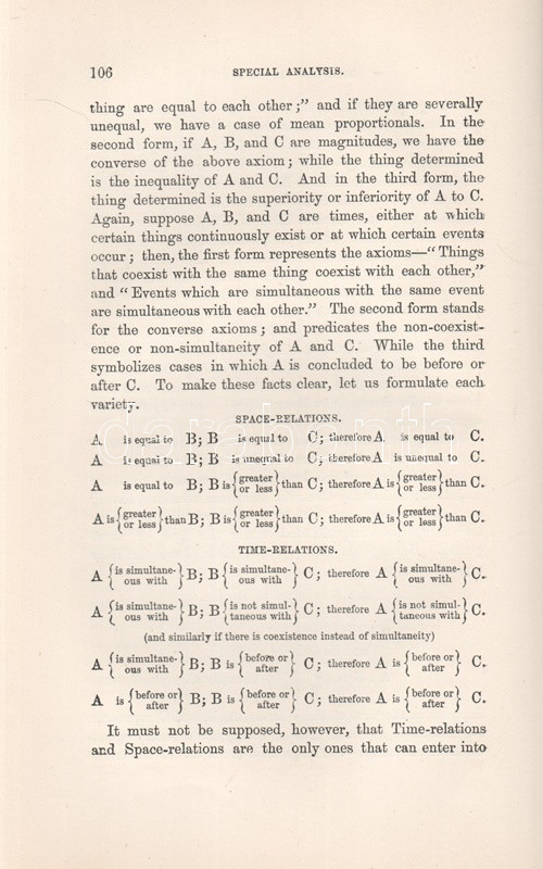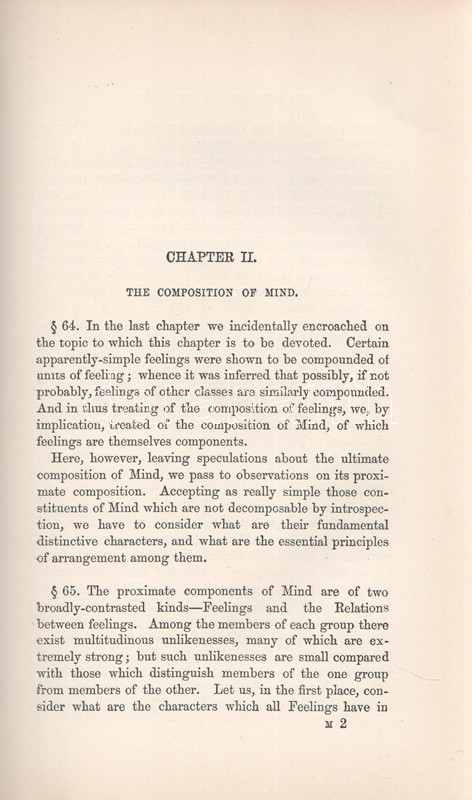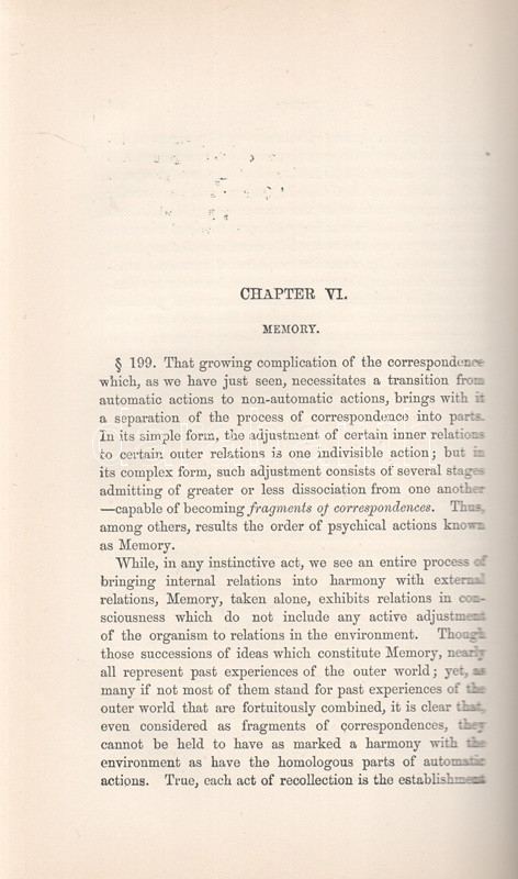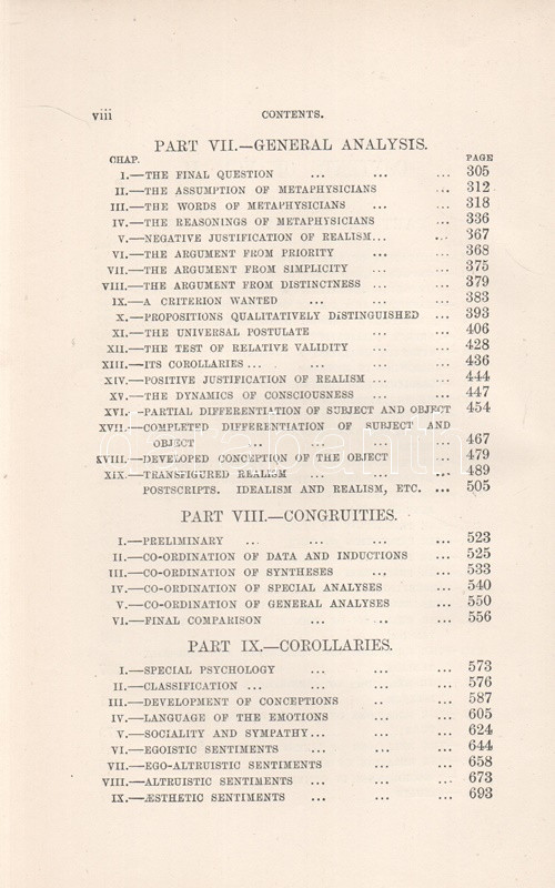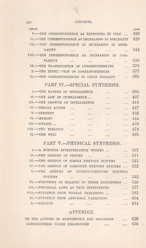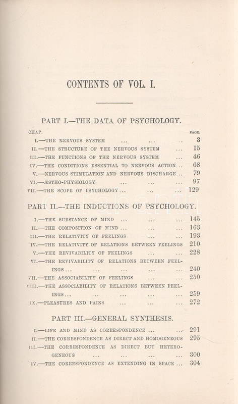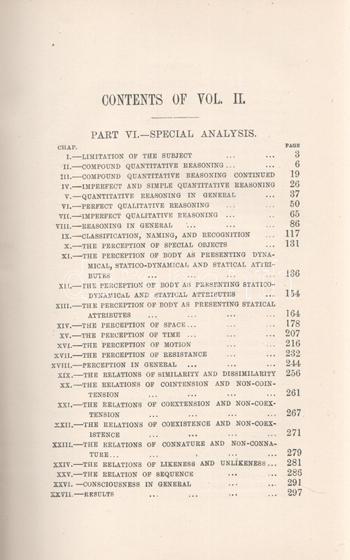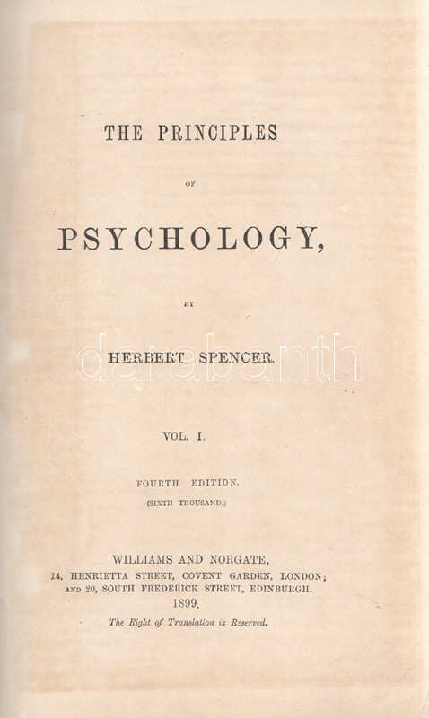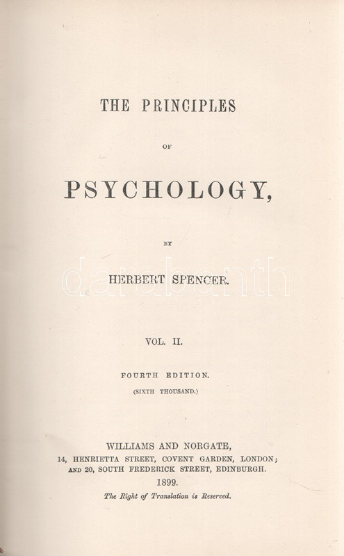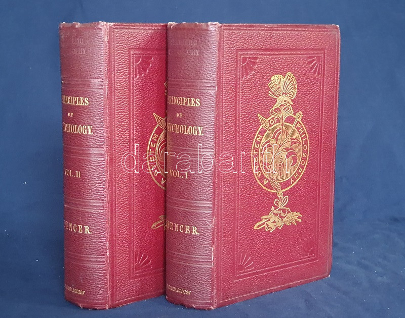 Spencer, Herbert: The Principles of Psychology. Vol. I-II. Fourth Edition. [Teljes mű két kötetben.] London, 1899. Williams and Norgate (Printed by Harrison and Sons). [III]-XIV + 640 + [6] p.; VIII + 762 + 14 + [2] p. Herbert Spencer (1820-1903) angol filozófus, a XIX. század második felének megkerülhetetlen gondolkodója. Fő művében, tíz kötetben kidolgozott filozófiai rendszerében kora minden számottevő kérdésében kifejtette evolucionista álláspontját: gazdasági, szociológiai, biológiai, lélektani, etikai, vallási, filozófiai, politikai témákban egyaránt. A nagy szintetizáló munka három évtized alatt készült el, kötetei 1862 és 1892 között jelentek meg. A nagy mű lélektani kötetei először 1870-ben és 1880-ban láttak napvilágot. Herbert Spencer filozófiai szempontból, nagyon tág látóhatárral közelíti meg a lélektant; a munka az idegrendszeri alapozás után bőségesen foglalkozik a megismerés, a rendszerezés, a kategorizálás, az érvelés formáival, kifejti álláspontját a tudatról, az akaratról és az érzelmekről: A tág filozófiai rendszerbe illesztett lélektan ennek megfelelően távolról sem esetleírások és gyógyászati javallatok rendszere. Oldalszámozáson belül néhány szövegközti ábrával. (A System of Synthetic Philosophy, Volume IV-V.) Egységes, aranyozott, vaknyomásos kiadói egészvászon kötésben. Jó példány.