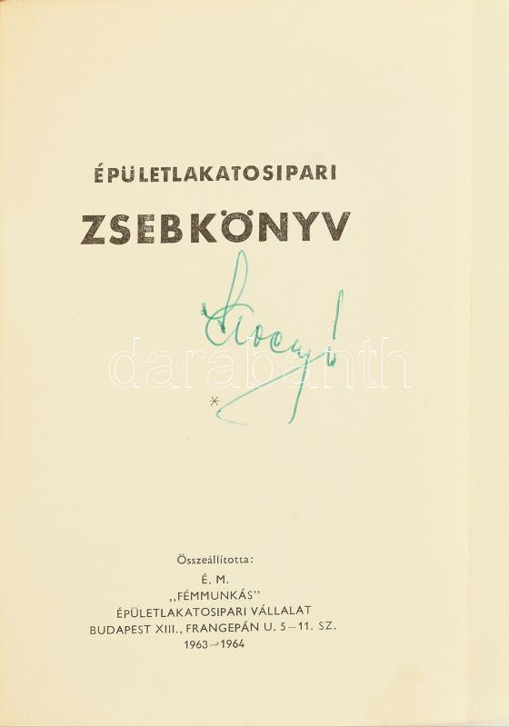 Épületlakatosipari zsebkönyv. Összeáll.: É. M. "Fémmunkás" Épületlakatosipari Vállalat. Bp., é.n., (Athenaeum-ny.), 233+(7) p. Fekete-fehér képekkel, ábrákkal gazdagon illusztrált. Kiadói egészvászon-kötés, jó állapotban, a címlapon névbejegyzéssel. Megjelent 5000 példányban.