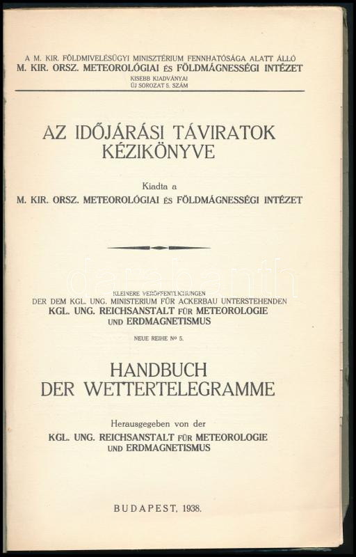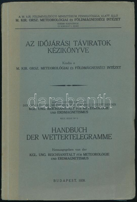 Az időjárási táviratok kézikönyve. Bp., 1938, M. Kir. Országos Meteorológiai és Földmágnesességi Intézet. Kiadói papírkötés, gerincnél szakadt, kissé kopottas állapotban.