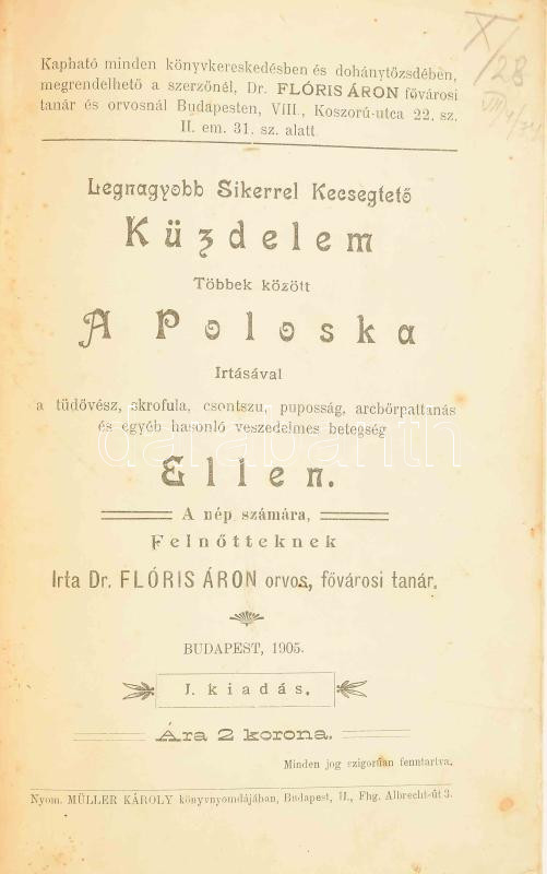 Dr. Flóris Áron: Legnagyobb Sikerrel Kecsegtető Küzdelem Többek között A Poloska Irtásával a tüdővész, skrofula, csontszu, puposság, arcbőrpattanás és egyéb hasonló veszedelmes betegség ellen. A nép számára, felnőtteknek irta - - . Bp., 1905, szerzői kiadás (Müller Károly-ny.), 222 p. (eredetileg 224 p.) Első kiadás. Átkötött papírkötésben, helyenként kissé foltos lapokkal, a 15-16. oldalt a címlap után kötötték be, az utolsó lap hiányzik. Ritka!
