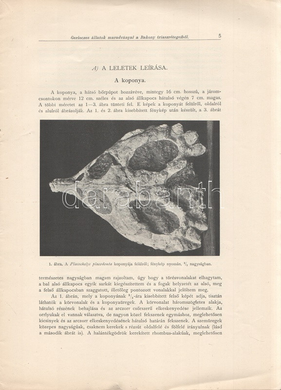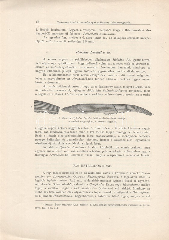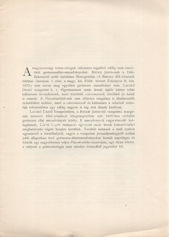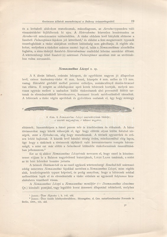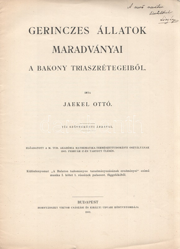 Jaekel Ottó: Gerinczes állatok maradványai a Bakony triaszrétegeiből. Tíz szövegközti ábrával. (Lóczy Lajos ajándékozási bejegyzésével.) Budapest, 1902. Hornyánszky Viktor ny. 22 + [2] p. A címoldalon: ,,A szerző nevében tisztelettel: Lóczy Lajos". Otto Jaekel (1863-1929) nemzetközi hírű német paleontológus 1902 februárjában tartott előadást az MTA Természettudományi Osztályának szervezésében., az előadáson a Laczkó Dezső (1860-1932) és Lóczy Lajos (1849-1920) geológusok által Veszprém környékén által azonosított őslények paleontológiai elemzését végezte el; az előadásban említett őslénytípusok némelyike a magyar tudósok nevét viseli, így Lóczy Lajosét, a dedikáció íróét. Oldalszámozáson belül szövet közt számos őslénytani ábra. (Különlenyomat ,,A Balaton tudományos tanulmányozásának eredményei" című munka I. kötet 1. részének paleontológiai függelékéből.) Fűzve, enyhén sérült kiadói borítóban.