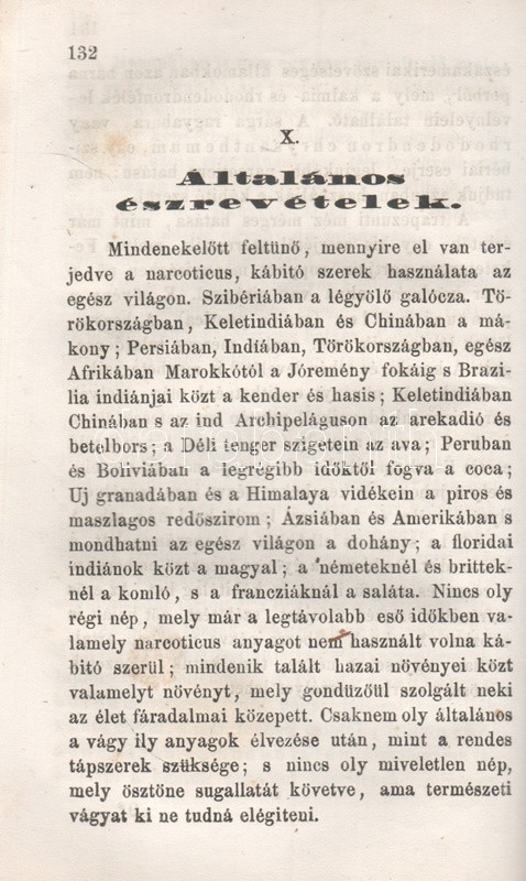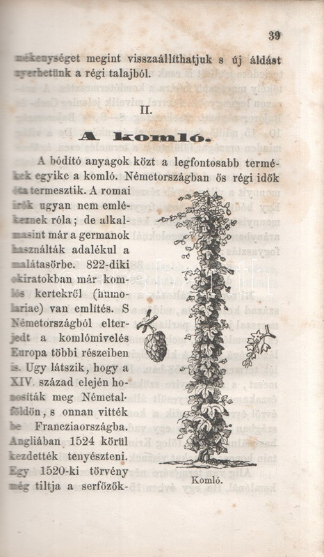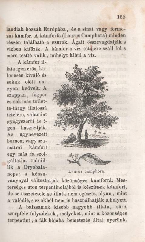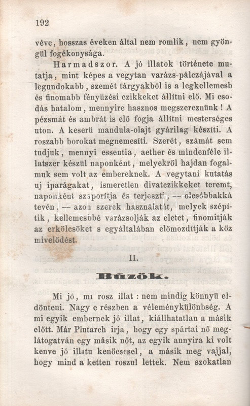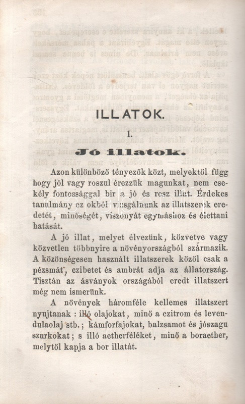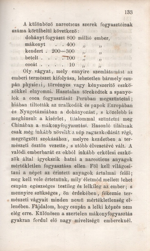 Johnston, James Finlay Weir: Vegytani képek a közéletből. Johnston nyomán kiadja Csengery Antal. Második kötet. Pest, 1857. Pfeifer Ferdinánd tulajdona [Emich ny.] 324 + VII + [1] p. Egyetlen magyar kiadás. James Finley Weir Johnston (1796-1855) skót agrokémikus és élelmiszervegyész élettani, nemzetgazdaságtani és népjellemtani kitérőkben bővelkedő kétkötetes monográfiája eredeti nyelven először 1855-ben jelent meg, ,,Chemistry of Common Life" címmel. Az oldalszámozáson belül szövegközti ábrákkal illusztrált munka első kötete a légkörtani, talajtani, mezőgazdasági és állattenyésztési bevezetők után a húsfajták feldolgozásával foglalkozik, majd rátér az alkoholmentes és alkoholos italok vegy-, élet- és kórtanára, a második kötet pedig a bódító szerek: a dohány, a komló, a mákony, a kender, a bétel és a kokalevél vegy- és élettanát tárgyalja, népjellemtani és nemzetgazdasági megjegyzésekkel keverten. A második kötetből megismerhetjük a szerző vélekedését a különféle bódító szerek fogyasztásának térbeli-kulturális mintázatairól (kultúrember nem fogyaszt dohányt), majd a kellemes illatok és kellemetlen szagok növényi és állati forrásait tárgyalja, végül a légzés és emésztés élettanának élelmiszerkémiához kapcsolódó fejezeteit nyújtja. Példányunk címlapján kisebb javítások, katalóguscímke, valamint gyűjteményi bélyegzések, ez utóbbi megismétlődik a belív első nyomtatott oldalán is. A leveleken enyhe foxing. Az első előzéken színes könyvjegyen a könyv épségének megőrzésére vonatkozó szigorú utasítás, a címlapon hasonlóan szigorú hangú tiltás a kötet tovább-értékesítésére vonatkozóan. Példányunkból két levél hiányzik. Poss.: Pest-Budai Könyvnyomdászok és Betűöntők Egylete, Magyarországi Könyvnyomdászok és Betűöntők Szakegylete. Korabeli, enyhén kopott félvászon kötésben, a gerincen katalóguscímkével.