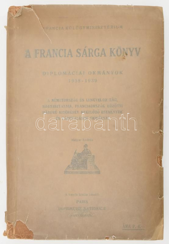 A francia sárga könyv. Diplomáciai okmányok 1938-1939. A Németország és Lengyelország, Nagybritannia, Franciaország közötti háború kitörését megelőző események és tárgyalások okmányai. Magyar fordítás. Budapest, 1939. Francia Külügyminisztérium (Pápai Ernő műintézete). 270 p. A francia diplomácia levélváltásai Adolf Hitler politikája, a német terjeszkedés, Csehszlovákia felosztása: a müncheni konferencia, valamint a háború kitörése kapcsán. Fűzve, kiadói borítóban, szélén gyűrődéssel