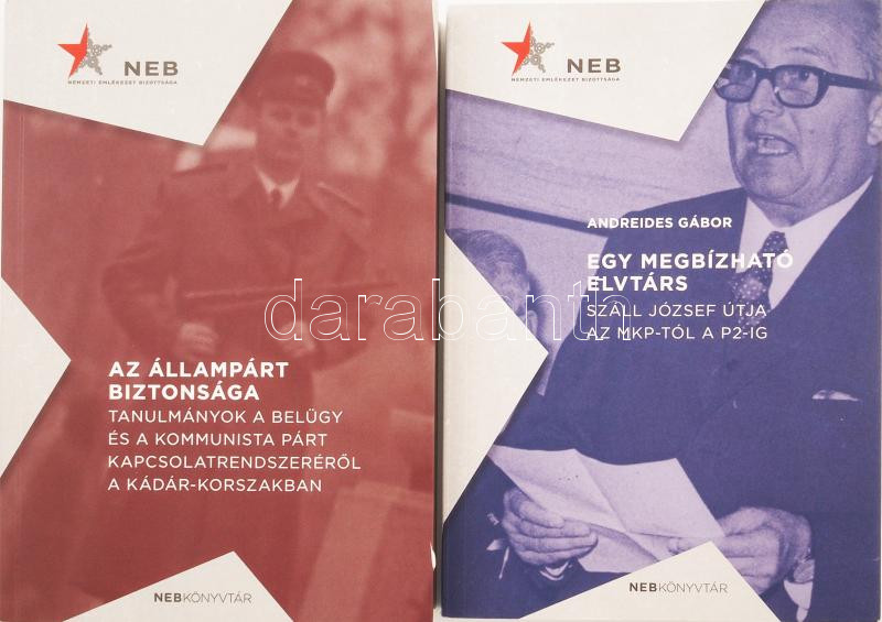 2 db könyv: Andreides Gábor: Egy megbízható elvtárs - Száll József útja az MKP-tól a P2-ig. Bp., 2019, Nemzeti Emlékezet Bizottságának Hivatala. Kiadói papírkötésben. + Horváth Zsolt, Kiss Réka, Simon István (szerk.): Az állampárt biztonsága - Tanulmányok a belügy és a kommunista párt kapcsolatrendszeréről a Kádár-korszakban. Kiadói papírkötésben.
