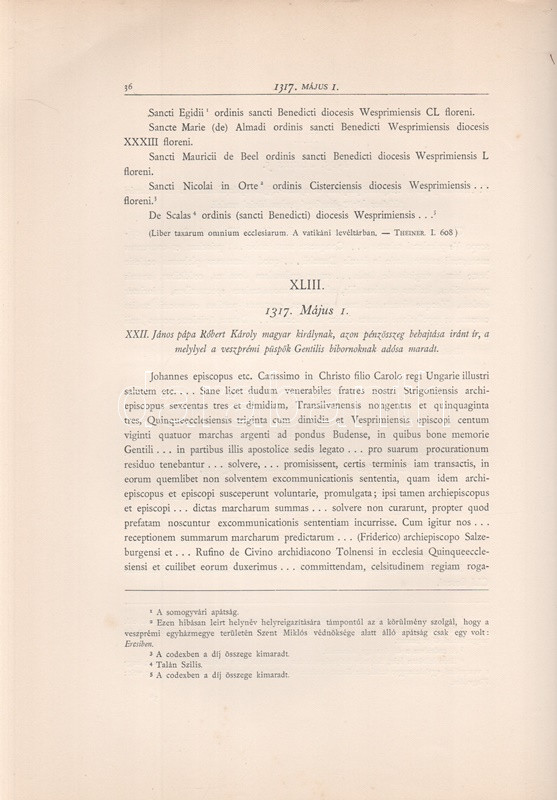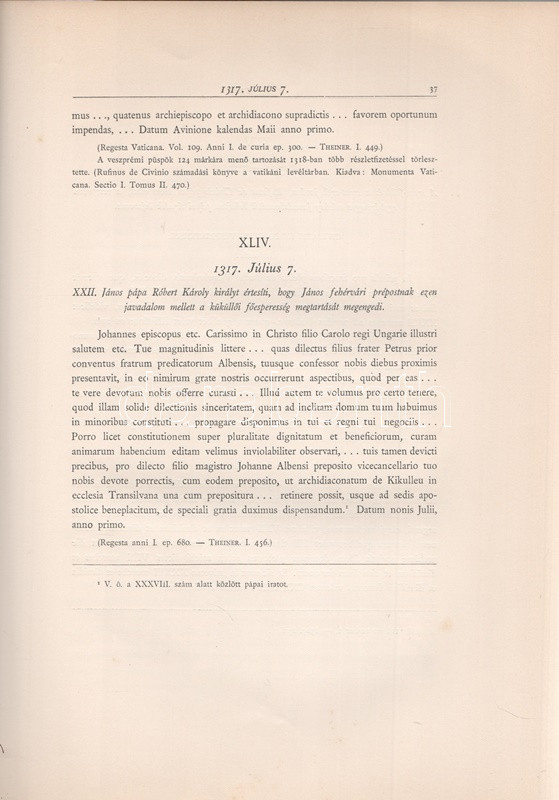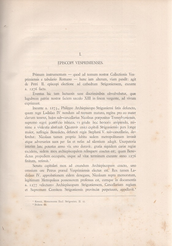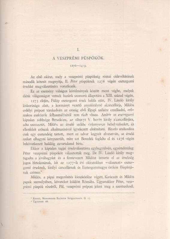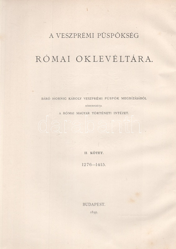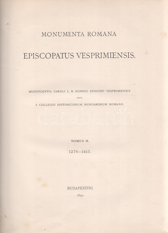 A veszprémi püspökség római oklevéltára. Monumenta Romana Episcopatus Vespremiensis. II. kötet. 1276-1415. Budapest, 1899. Római Magyar Történeti Intézet (Franklin-Társulat nyomdája). CII + [2] + 467 + [1] p. Folio. Egyetlen kiadás. A pápai adminisztráció által a veszprémi püspökség számára kiadott latin nyelvű pápai oklevelek jó bepillantást nyújtanak a katolikus egyházon belüli ügymenet szerteágazóságára. Jóllehet a legtöbb oklevél kinevezési, utódlási és búcsú-engedélyezési ügyekben keletkezik, a Szentszék számos esetben bírói hatalmat is ad a püspökségnek a katolikus egyházat ért sérelmek ügyében. A Szentszék olykor feloldja a kiközösítést, olykor leromboltatja az engedély nélkül épült zsidó imaházat, olykor megsemmisíti a hozzájárulása nélkül végbevitt érseki kinevezést. Valamennyi oklevélszöveg előtt rövid magyar nyelvű összefoglaló, a könyv testét kitevő oklevélanyag előtt terjedelmes latin és magyar nyelvű bevezető. A sorozat négy kötetben dolgozza fel a Szentszék és a veszprémi püspökség 1103-1526 közötti kapcsolatát, példányunk az önállóan is megálló II. kötet a sorozatban. Aranyozott gerincű, XX. század első feléből származó félvászon kötésben. Jó példány.