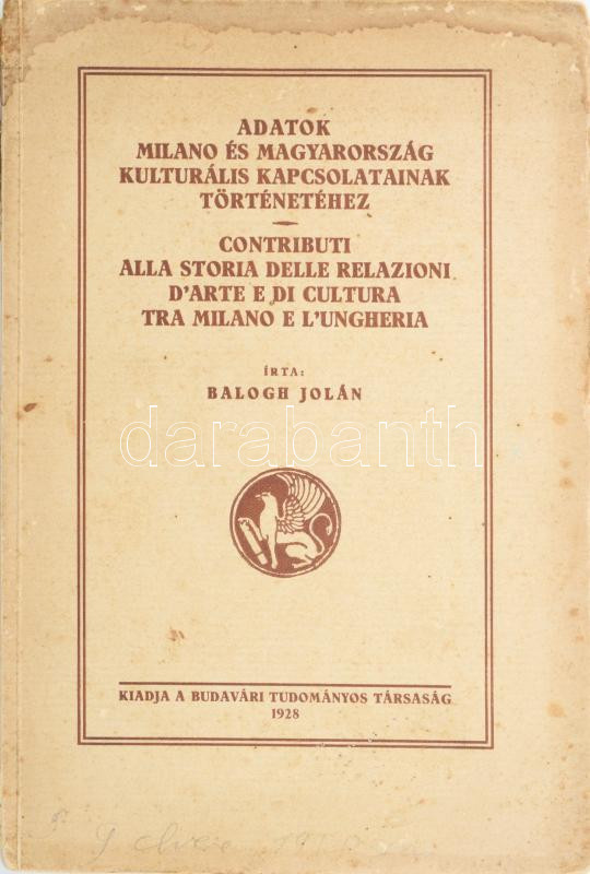 Balogh Jolán: Adatok Milano és Magyarország kulturális kapcsolatainak történetéhez. Contributi alla storia delle relazioni d'arte e di cultura tra Milano e l'Ungheira. A budapesti Királyi Magyar Pázmány Péter Tudományegyetem Művészettörténeti Gyűjteményének dolgozatai VIII. Bp., 1928., Budavári Tudományos Társaság, Kir. Magy. Egyetemi-ny., 90+2 p. + 20 t. Magyar és olasz nyelven. Balogh Jolán (1900-1988) művészettörténész. Szakterülete közé tartozott a reneszánsz művészet, a középkori magyar és külföldi szobrászat, az itáliai-magyar művészeti kapcsolatok, valamint az erdélyi művészet. Ez az első önálló munkája. Kiadói papírkötés, sérült gerinccel, foltos.