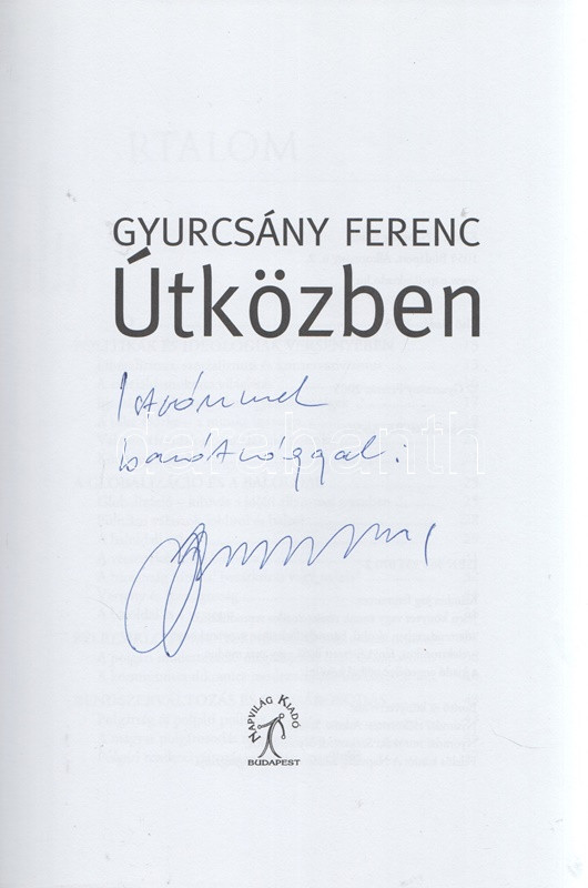 Gyurcsány Ferenc: Útközben. [Politikai esszék.] (Dedikált.) Budapest, (2005). Napvilág Kiadó (Szekszárdi Nyomda Kft.) 136 p. Egyetlen kiadás. Dedikált: ,,[Horváth] Istvánnak, barátsággal: Gyurcsány Ferenc". (Demos könyvek.) Prov.: Horváth István (sz. 1943) közgazdász, diplomata, nagykövet. A közgazdász szerző 1966-tól a külkereskedelemben dolgozott, 1979-től az MSZMP Gazdaságpolitikai Bizottságának tagja, 1983-tól hágai, 1984-1991 között bonni nagykövet, majd Horn Gyula külpolitikai tanácsadója. Színes, illusztrált kiadói kartonkötésben és színes, illusztrált kiadói védőborítóban.