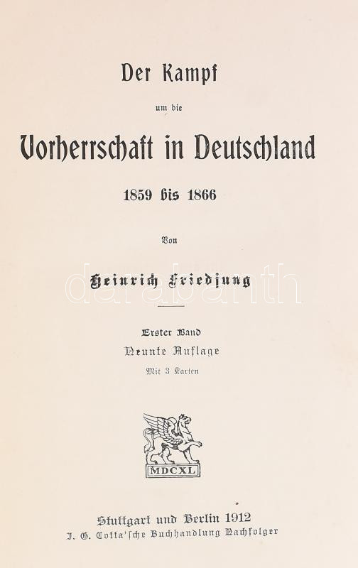 Heinrich Friedjung: Der Kampf um die Vorherrschaft in Deutschland 1859 bis 1866. I-II. Bände. Stuttgart - Berlin, 1812, J.G. Cotta'sche Buchhandlung. Német nyelven. 3 és 6 térképmelléklettel. Korabeli félbőr-kötésben, márványozott lapélekkel, szép állapotban.
