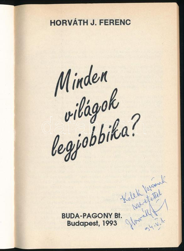 Horváth J. Ferenc: Minden világok legjobbika?. Bp., 1993, Buda-Pagony Bt.. A szerző, Horváth J. Ferenc (1930-2000) újságíró, az MTV korábbi főszerkesztő-helyettese által Kolek Vera újságíró, a rádió riportere részére DEDIKÁLT! Kiadói papírkötés.