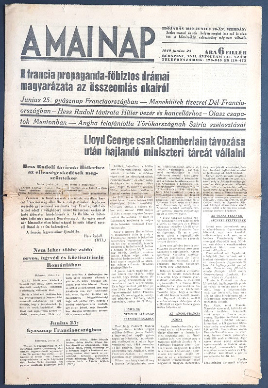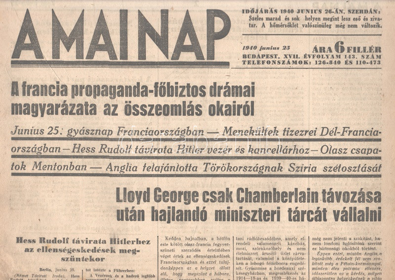 [II. Világháború] A Mai Nap. 1940. június 25. (Napilap, XVII. évfolyam, 143. szám) "A francia propaganda-főbiztos drámai magyarázata az összeomlás okairól -- Junius 25: gyásznap Franciaországban -- Menekültek tizezrei Dél-Franciaországban -- Hess Rudolf távirata Hitler vezér és kancellárhoz --.Olasz csapatok Mentonban -- Anglia felajánlotta Törökországnak Sziria szétosztását -- Lloyd George csak Chamberlain távozása után hajlandó miniszteri tálcát vállalni." Félbehajtva, jó állapotban.