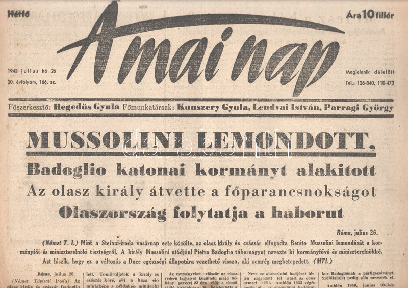 [II. Világháború] A Mai Nap. 1943. július 26. (Napilap, 20. évfolyam, 166. szám) "Mussolini lemondott, Badoglio katonai kormányt alakitott -- Az olasz király átvette a főparancsnokságot -- Olaszország folytatja a háborut -- Jól leplezett aknazárak és egyéb akadályok nehezitik az amerikai előnyomulást Sziciliában." Félbehajtva, jó állapotban.