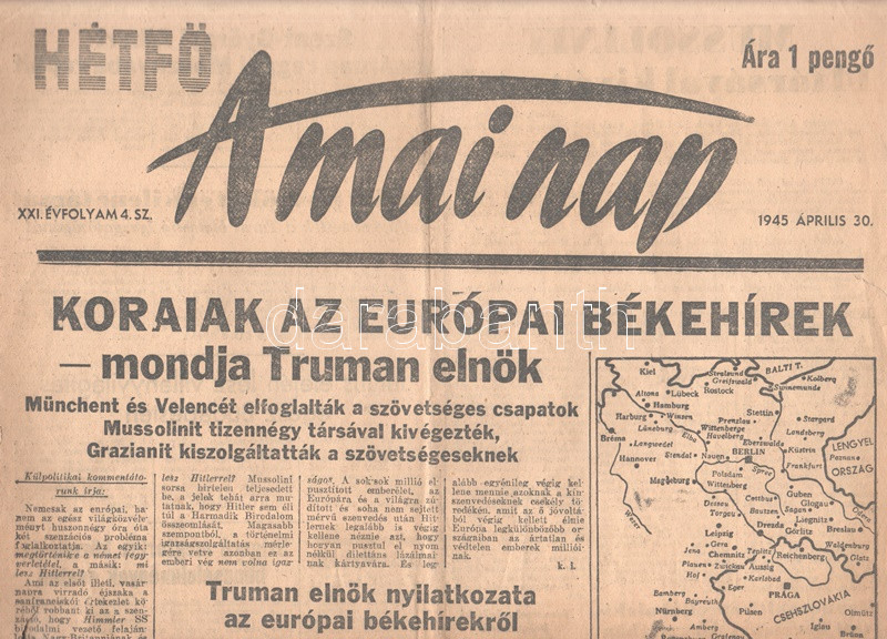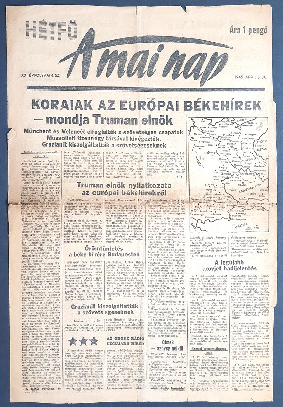 [II. Világháború] A Mai Nap. 1945. július 26. (Napilap, XXI. évfolyam, 4. szám) "Koraiak az európai békehírek - mondja Truman elnök -- Münchent és Velencét elfoglalták a szövetséges csapatok -- Mussolinit tizennégy társával kivégezték -- Grazianit kiszolgáltatták a szövetségeseknek." Félbehajtva, jó állapotban.