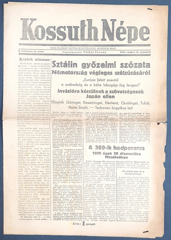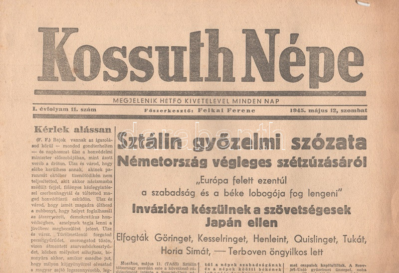 [II. Világháború] Kossuth Népe. 1945. május 12. (Napilap, I. évfolyam, 11. szám) "Sztálin győzelmi szózata Németország végleges szétzúzásáról -- Invázióra készülnek a szövetségesek Japán ellen -- Európa felett ezentúl a szabadság és a béke lobogója fog lengeni -- Elfogták Göringet, Kesselringet, Henleint, Quislinget, Tukát, Horia Simát - Terboven öngyilkos lett." Félbehajtva, jó állapotban.