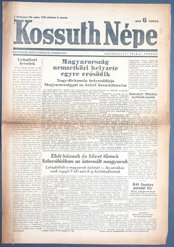 [II. Világháború] Kossuth Népe. 1945. október 3. (Napilap, I. évfolyam, 128. szám) "Magyarország nemzetközi helyzete egyre erősödik -- Nagy-Britannia helyreállítja Magyarországgal az üzleti összeköttetését -- Ekét húznak és követ törnek Szlovákiában az internált magyarok." Félbehajtva, jó állapotban.
