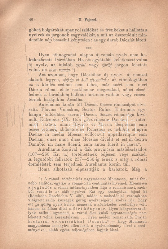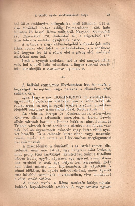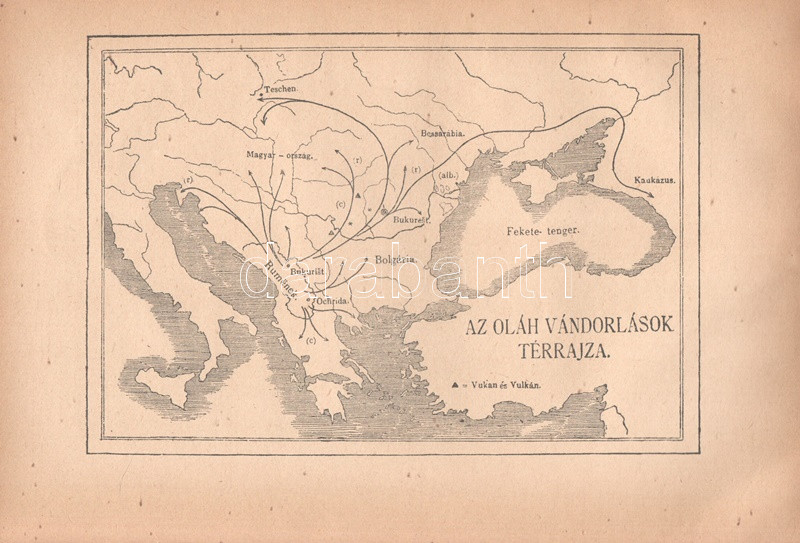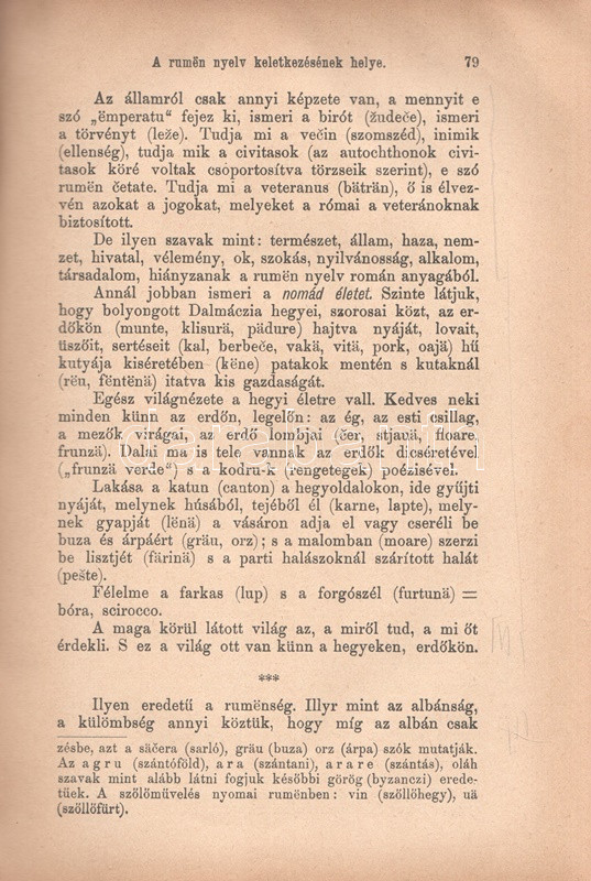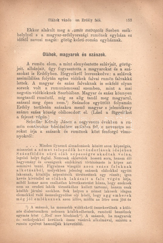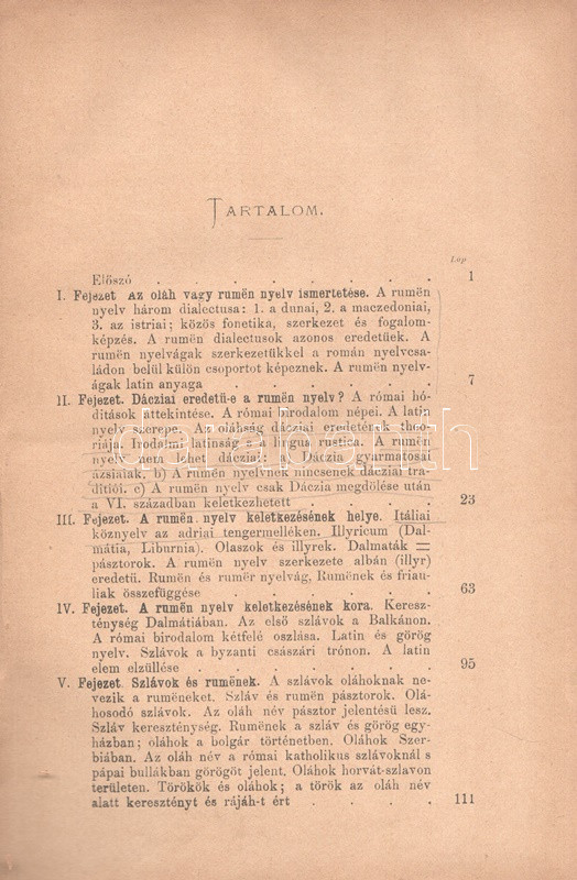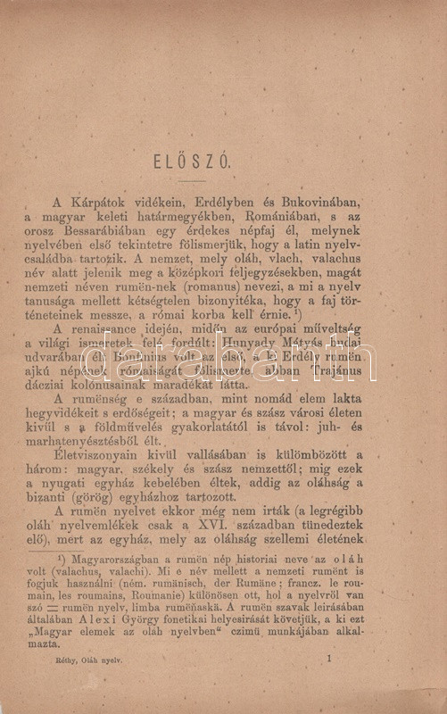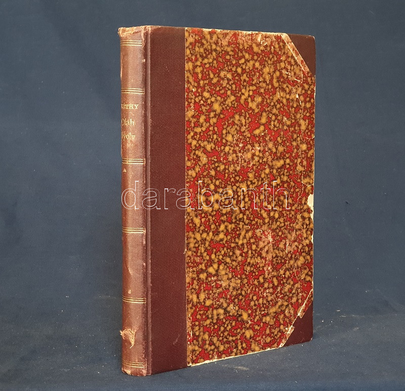 Réthy László: Az oláh nyelv és nemzet megalakulása. Nagy-becskerek, 1890. Pleitz Ferenc Pál könyvnyomdája. [8] + 268 p. Réthy László (1851-1914) etnográfus, numizmata, szlavista, orientalista, valamint Lőwy Árpád álnéven elhíresült költő. Számos keleti nyelv ismerőjeként és numizmatikai szakértelme teljében írta meg értekezését a román nyelv és nemzet vitatott eredetéről. Nyelvészeti, etnológiai és történeti érvrendszerrel amellett érvel, hogy a rumén néven ismert nép etnogenezise az illír partvidékhez, Albániához köthető, és a nép csak hosszas vándorlás után, a 13. század után érkezett meg Erdély kárpáti határaira. Réthy László úgy véli, hogy a Dacia provinicabeli római civilizáció e határtartományban csupán halvány máz volt, és csak a legfelső vezetést itatta át a latin civilizáció provinciális változata; a bekövetkező germán és szláv vándorlásokkal az ideiglenesen meglevő, latin visszfényű civilizáció utód nélkül eltűnt, a később érkező románsággal pedig semmilyen összeköttetésben nem áll. Oldalszámozáson belül az illíriai eredetű pásztornép, a románság vándorlásainak rekonstruált, egész oldalas térképe. A munka első kiadása 1887-ben jelent meg, példányunk a munka második kiadásából származik. Az első előzéken Ex librisek. Példányunk fűzése meglazult, néhány oldal kijár a kötetből. Poss.: Vincze Frigyes, Molnár János. [Vincze Frigyes (1884-1963) a budapesti Kereskedelmi Akadémia tanára, kereskedelmi szakíró. Molnár János helytörténész, kecskeméti népművészeti és könyvgyűjtő, a kecskeméti Katona József Társaság vezetőségi tagja, számos magyar író, költő erdélyi úti kalauza, számos erdélyi költő, író kecskeméti házigazdája az 1960-1980-as években.] (Történeti nép- és földrajzi könyvtár, XX. kötet.) Aranyozott, enyhén sérült gerincű korabeli félvászon kötésben, márványmintás festésű lapszélekkel.