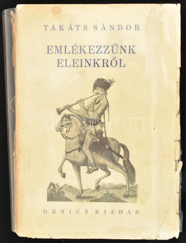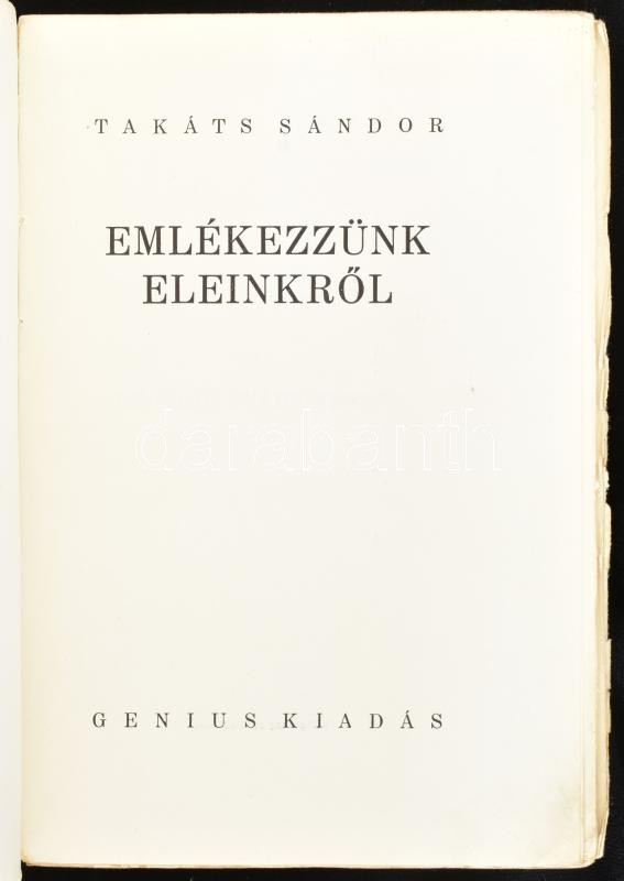 Takáts Sándor: Emlékezzünk eleinkről. Bp., [1929], Genius (Világosság-ny.), 594+(2) p. Első kiadás. Kiadói papírkötés, sérült, szétvált állapotban (a borító és a gerinc sérült, a könyvtest két részre vált, de egyébként olvasható, jó állapotú lapokkal), átlátszó műanyag védőborítóban.