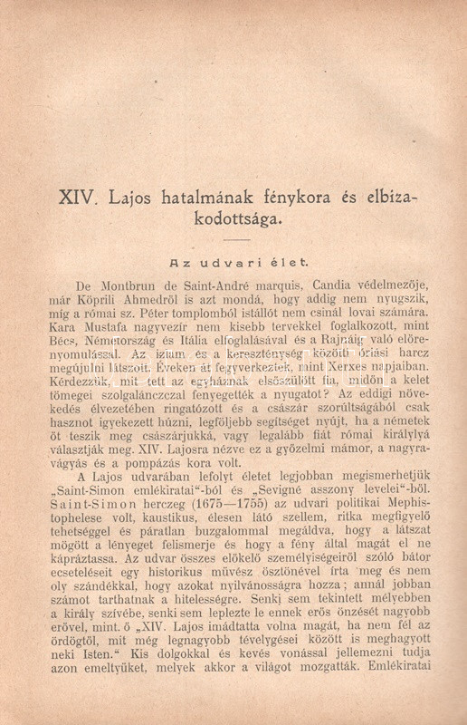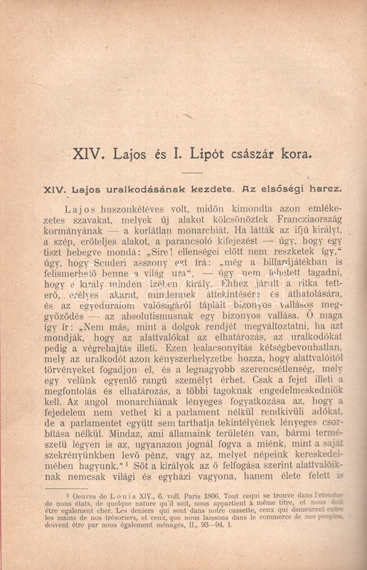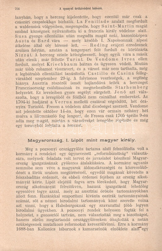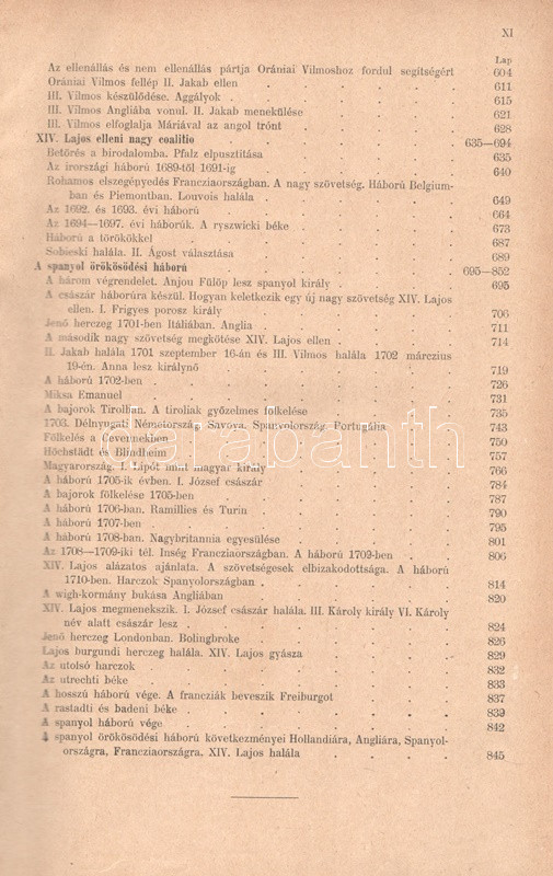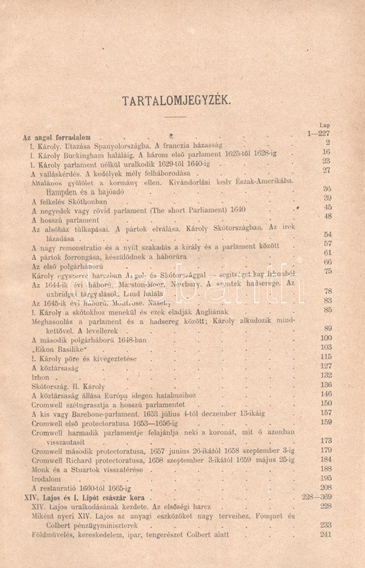 Weisz Keresztély János [Weiss, Johann Baptist]: Világtörténet. 10. kötet: Az angol forradalom. I. Lipót császár és XIV. Lajos király kora. A harmadik javított és bővített kiadás után többek közreműködésével fordította és kiadja Szabó Ferencz. Nagybecskerek, 1903. Pleitz Ferenc Pál könyvnyomdája. XI + [1] + 852 p. Egyetlen magyar kiadás. A monumentális, összesen 22 kötetből álló történeti áttekintés szerzője Johann Baptist Weiss (1820-1899) badeni születésű osztrák történetíró, a freiburgi és a grazi egyetem tanára. A katolikus szellemben megírt grandiózus történeti összefoglalás a kezdetektől a bécsi kongresszusig tekinti át az egyetemes történelem folyamatait, diplomáciai, esemény-, jog- és hadtörténeti, politikai, vallás- és egyháztörténeti, művelődés- és oktatástörténeti, néprajzi aspektusokból. A munka emlékezetességét ritka erős katolikus nézőpontja biztosítja, mely sok esetben élénk színekkel vázolja a katolikus egyházat ért sérelmeket. Példányunk az angol polgári forradalom kezdetétől a spanyol örökösödési háború végéig tekinti át az európai államok és háborúk politikai eseménytörténetét, angol és francia fókusszal, a török háborúk kapcsán időnkénti kitéréssel Magyarország és Lengyelország XVII. századi történetére is. Példányunk két ívének fűzése enyhén meglazult. Díszesen aranyozott, enyhén kopott kiadói félbőr kötésben, vörös festésű lapszélekkel. Jó példány.