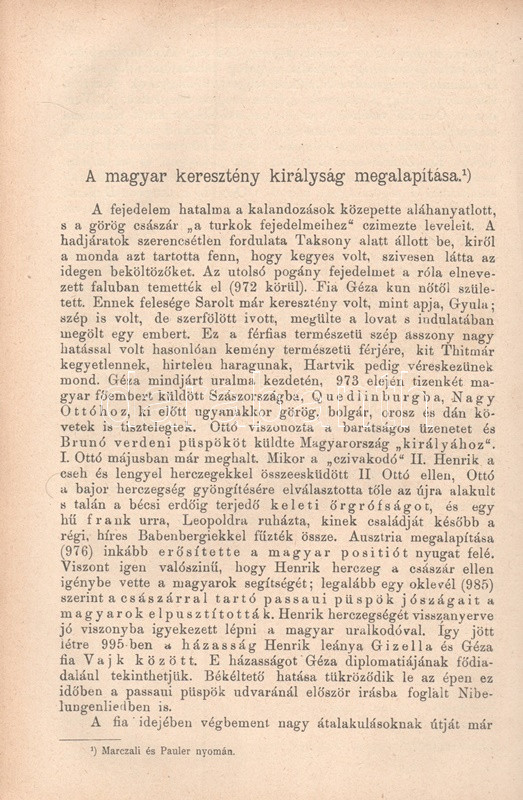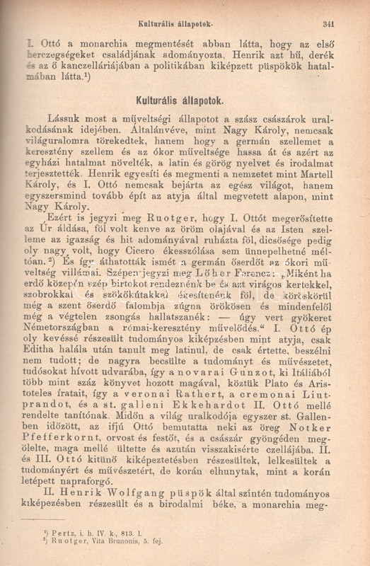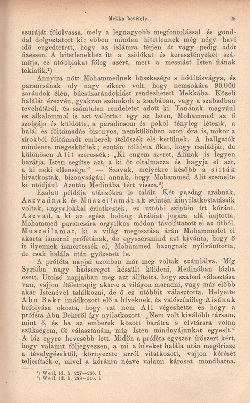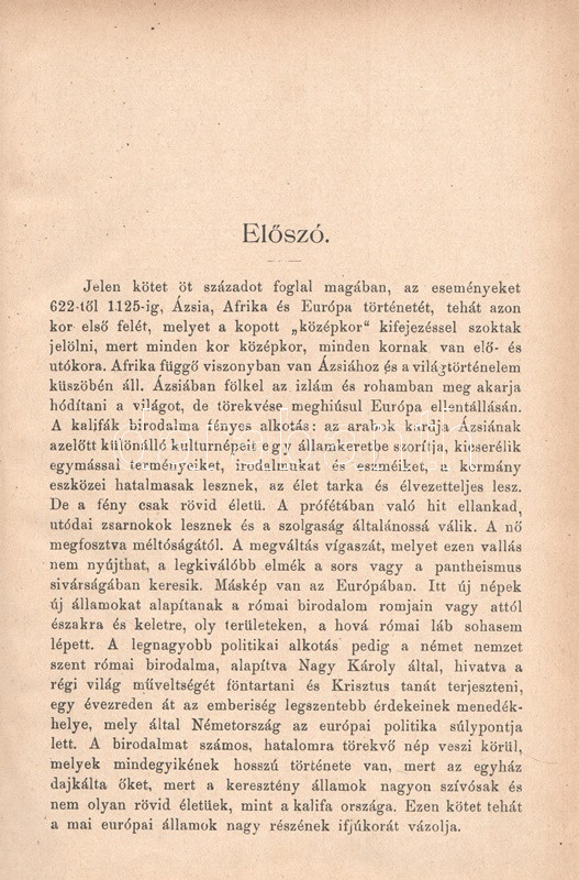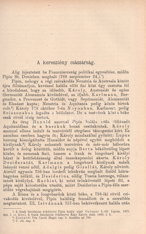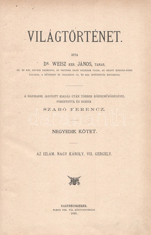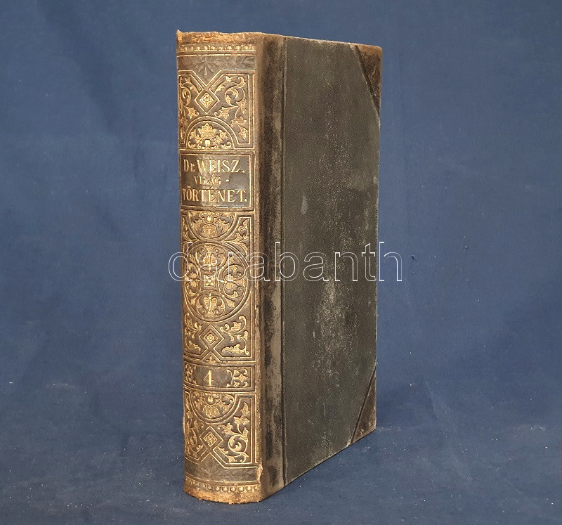 Weisz Keresztély János [Weiss, Johann Baptist]: Világtörténet. 4. kötet: Az izlám, Nagy Károly. VII. Gergely. A harmadik javított kiadás után többek közreműködésével fordította és kiadja Szabó Ferencz. Nagybecskerek, 1899. Pleitz Ferenc Pál könyvnyomdája. XII + 793 + [1] p. Egyetlen magyar kiadás. A monumentális, összesen 22 kötetből álló történeti áttekintés szerzője Johann Baptist Weiss (1820-1899) badeni születésű osztrák történetíró, a freiburgi és a grazi egyetem tanára. A katolikus szellemben megírt grandiózus történeti összefoglalás a kezdetektől a bécsi kongresszusig tekinti át az egyetemes történelem folyamatait, diplomáciai, esemény-, jog- és hadtörténeti, politikai, vallás- és egyháztörténeti, művelődés- és oktatástörténeti, néprajzi aspektusokból. Az áttekintés különös előszeretettel tér ki a különféle népek mondáira, vallási rítusaira, az archaikus társadalomszervezési formákra, később az állami apparátus megszervezésére, a családon belül a gyermekek és a nők jogaira, a művelődéstörténetre. A munka emlékezetességét ritka erős katolikus nézőpontja biztosítja, mely sok esetben élénk színekkel vázolja az éppen bemutatott társadalom hanyatlásának erkölcsi összetevőit, bár a katolikus egyház hatalmi zenitjét képező nagy-középkori kötetünk esetén tartózkodik ettől. Kötetünk az alcímmel ellentétben hosszú időszakot, az iszlám alapításától a nagy középkor századaiig terjedő időszakot tekinti át (630-1230). Európa új népeire és új kultúráira való tekintettel számos kitérővel a szláv, a viking hitvilágra, az izlandi és germán korai államszervezésre, majd a keresztény hitre térő népek egyes államainak néhány évszázados történetére. A magyar részek szokatlan terjedelméről feltehetően a fordító-átdolgozó gondoskodott. Példányunk két ívének fűzése enyhén meglazult, egy levele hiányzik. Díszesen aranyozott, enyhén kopott kiadói félbőr kötésben, vörös festésű lapszélekkel. Jó példány.