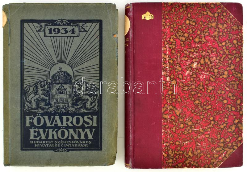 1934-1935 Fővárosi Évkönyv 1934. és 1935. évi számai. Bp., 1934-1935, Fővárosi Évkönyv. Kiadói papírkötés, és átkötött félvászon-kötés, bekötött papírborítóval, a papírborító szakadt, volt könyvtári példányok.