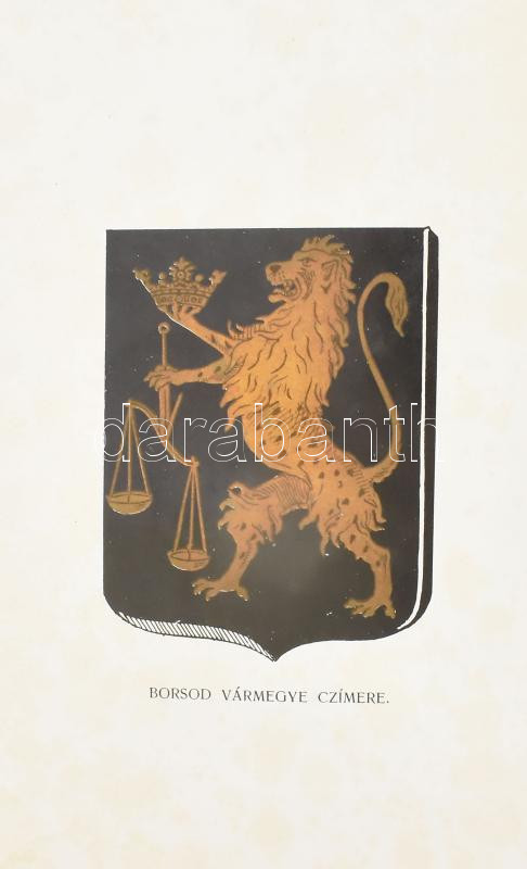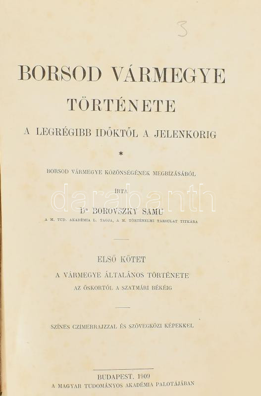Borovszky Samu: Borsod vármegye története a legrégibb időktől a jelenkorig. I. köt.: A vármegye általános története az őskortól a szatmári békéig. Bp., 1909, MTA, 1 t. +419 p. Unicus! A többi kötete nem jelent meg. Szövegközti rajzokkal illusztrált. Iglnyes modern félbőr kötésben, egy lap kijár.