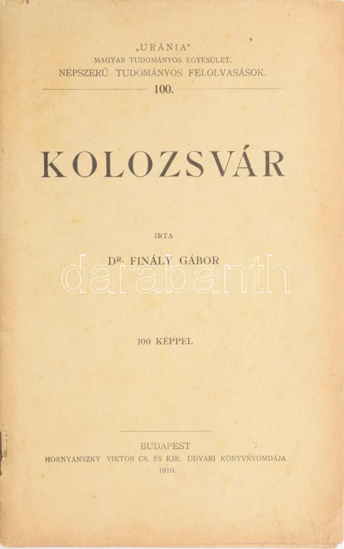 Finály Gábor: Kolozsvár. "Uránia" Népszerű Tudományos Felolvasások 100. Bp., 1910., Hornyánszky Viktor, 20+4 p. Kiadói papírkötés, borítóhiánnyal, az első és az utolsó lap levált. Ritka!