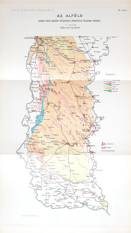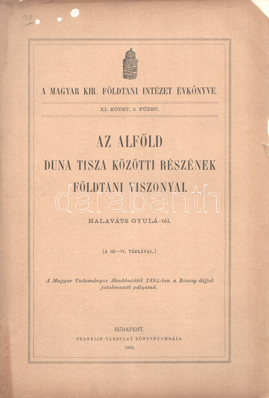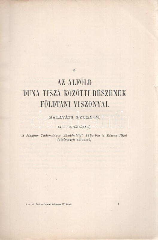 Halaváts Gyula: Az Alföld Duna-Tisza közötti részének földtani viszonyai. A Magyar Tudományos Akadémiától 1894-ben a Rózsay-díjjal jutalmazott pályamű. Budapest, 1895. Magyar Földrajzi Intézet - Franklin-Társulat ny. [101]-173 + [3] p. + 3 t. (kihajtható földtani szelvények, egy színes) + 1 térkép (színes, kihajtható). Egyetlen kötetkiadás. Halaváts Gyula (1853-1926) geológus, bányamérnök. Főként Magyarország részletes földtani felvételével foglalkozott, eleinte Somogyban, Baranyában, majd az Al-Duna mentén. Dolgozatában többek között artézi kútfúrások nyomán szerzett adatokkal térképezi fel a Duna-Tisza közének földtani szerkezetét. (A Magyar Kir. Földtani Intézet évkönyve, XI. kötet, 3. füzet.) Fűzve, enyhén hiányos gerincű kiadói borítóban. Nagyrészt felvágatlan, jó példány.