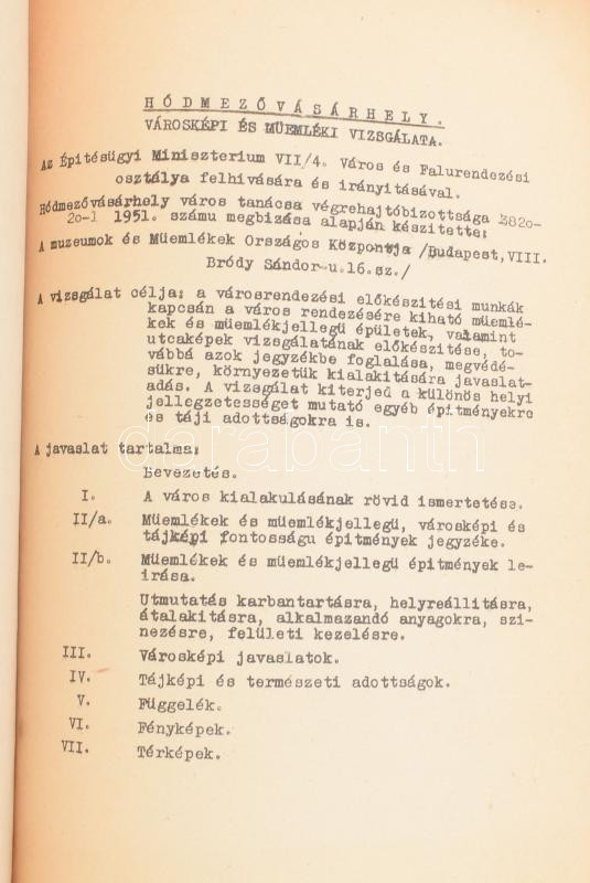 Hódmezővásárhely városképi és műemléki vizsgálata. Bp., 1951, Múzeumok és Műemlékek Országos Központja, 6+7+1+2+7+1+6+3+1+6+4 p. Papírkötésben, sérült gerinccel és kötéssel, a borítón bejegyzéssel.