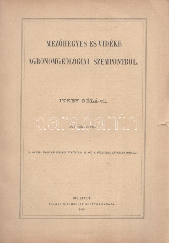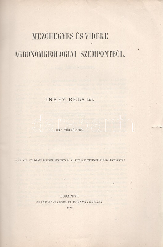 Inkey Béla (1847-1921) talajgeológus munkája a magyar királyi ménesbirtoknak helyet adó, Békés megyei Mezőhegyes és környékének talajtakaróját elemzi. A kapcsolódó színes, kihajtható térképen a geológiai részleteken kívül a vízrajzi, település-, közút-, és vasúthálózati részletek. Néhány levélen apró szakadásnyom.