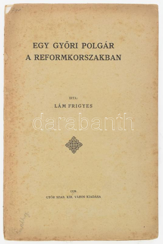 Lám Frigyes: Egy győri polgár a reformkorszakban. Győr, 1928, Győr szab. kir. város kiadása, 1 t. + 148 p. Kiadói papírkötés, szakadt borítóval, részben hiányos gerinccel, régi bélyegzéssel, felvágatlan lapokkal.