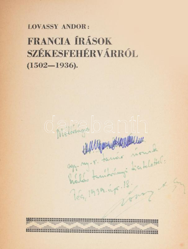 Lovassy Andor: Francia írások Székesfehérvárról (1502-1936). DEDIKÁLT! Székesfehérvár, 1939, Szerzői, (Pannonia-ny.), 32 p. Kiadói papírkötés, a dedikációban a nevet kisatírozták. + Marosi Arnold: Székesfehérvár műemlékei. Kiadja: Fejérvármegyei és Székesfehérvári Múzeumegyesület. Székesfehérvár, 1927, Debreczenyi István-ny., 4, p. Korabeli reklámokkal. Kiadói papírkötésben.