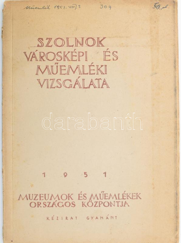 Szolnok városképi és műemléki vizsgálata. Bp., 1951, Múzeumok és Műemlékek Országos Központja, 1+3+5+1+2+9+1+6+3+1+6+2+2 p. Kiadói papírkötés, foltos borítóval, a gerincen apró sérülésekkel, az elülső borítón bejegyzéssel.