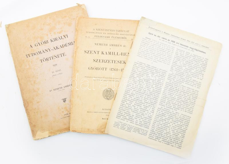 Vegyes Győrrel kapcsolatos tétel, 3 db: Németh Ambrus: A győri királyi tudomány-akadémia története III. rész. 1806-1850. Győr, 1904, Győregyházmegye Könyvsajtója, 135+5 p. Kiadói papírkötés, szakadozott, sérült borítóval, sérült, részben hiányos, foltos gerinccel. Felvágatlan lapokkal.; Németh Ambrus: Szent Kamill - rendi szerzetesek Győrött. (1761 - 1786). Szent István-Társulat Tudományos és Irodalmi Osztályának Felolvasó Üléseiből 91. sz. Bp., 1915, Szent-István-Társulat, 35+1 p. Kiadói papírkötés, szakadt, foltos borítóval. Felvágatlan lapokkal.; H. Pálfy Ilona: Győr. sz. kir. város az 1828. évi összeírás megvilágításában. Különlenyomat. Bp., 1934, Hornyánszky Viktor-ny., 10 p. Papírkötés, foltos.