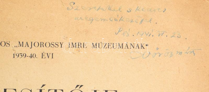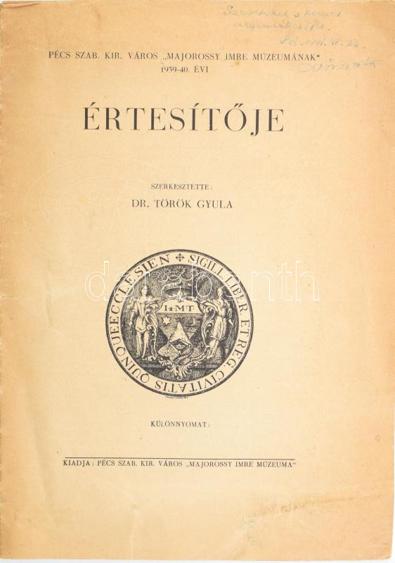 Vörös Márton: Pécsi tűzoltóság a XVIII. században. DEDIKÁLT! Különlenyomat: a Pécs Szab. Kir. Város "Majorossy Imre Múzeumának" 1939-1940. évi értesítőjéből. Pécs, 1940, Pécs Szab. Kir. Város "Majorossy Imre Múzeuma, 70-85 p. Papírkötés, az elülső borító hiányzik, a gerinc mentén sérüléssel, gyűrődésnyomokkal, kissé foltos.